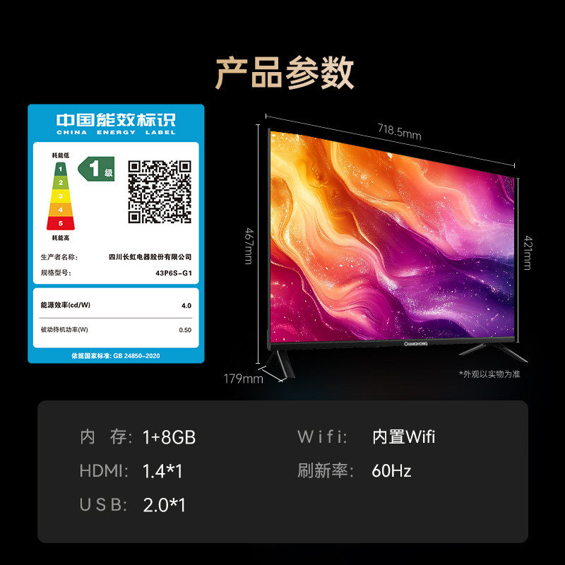 长虹P6S-G1 43英寸高清智能液晶平板电视机老人家用彩电官方正品
