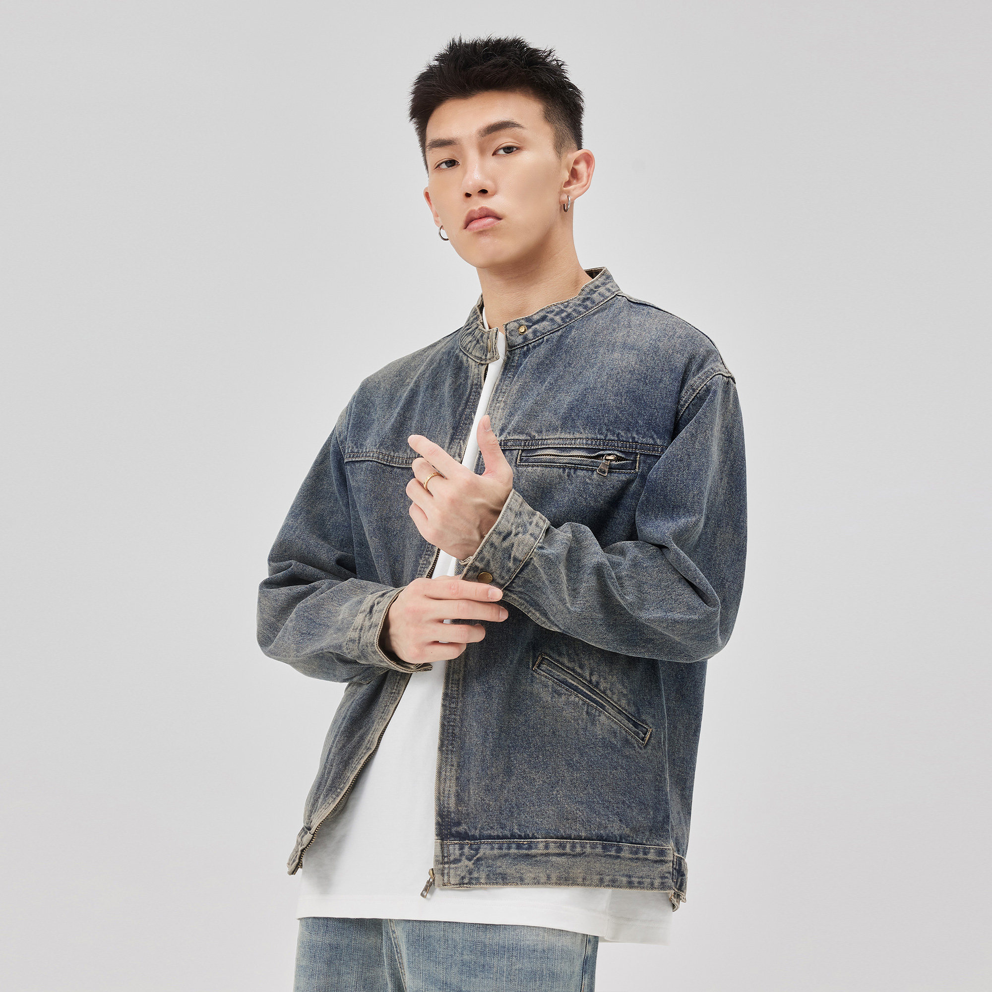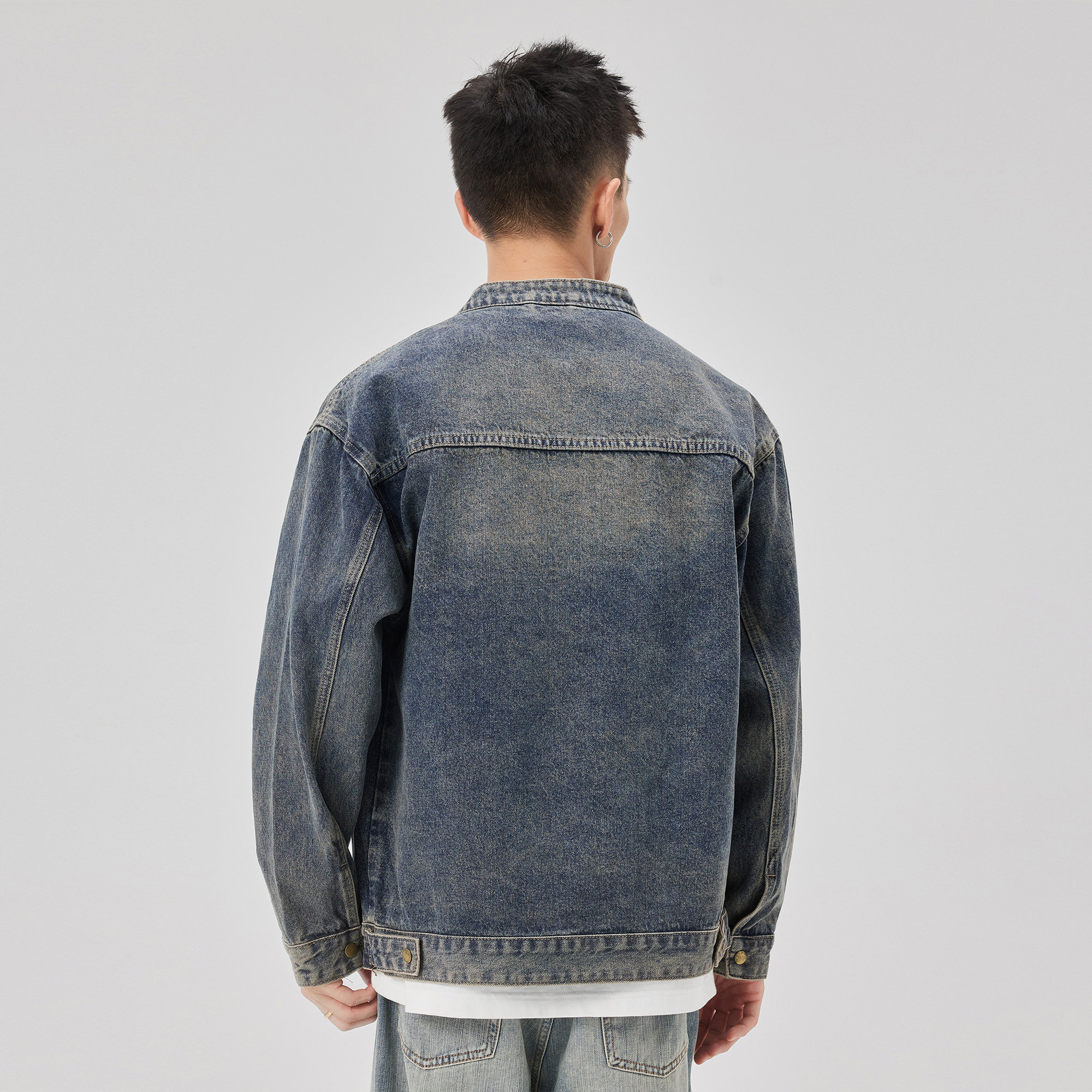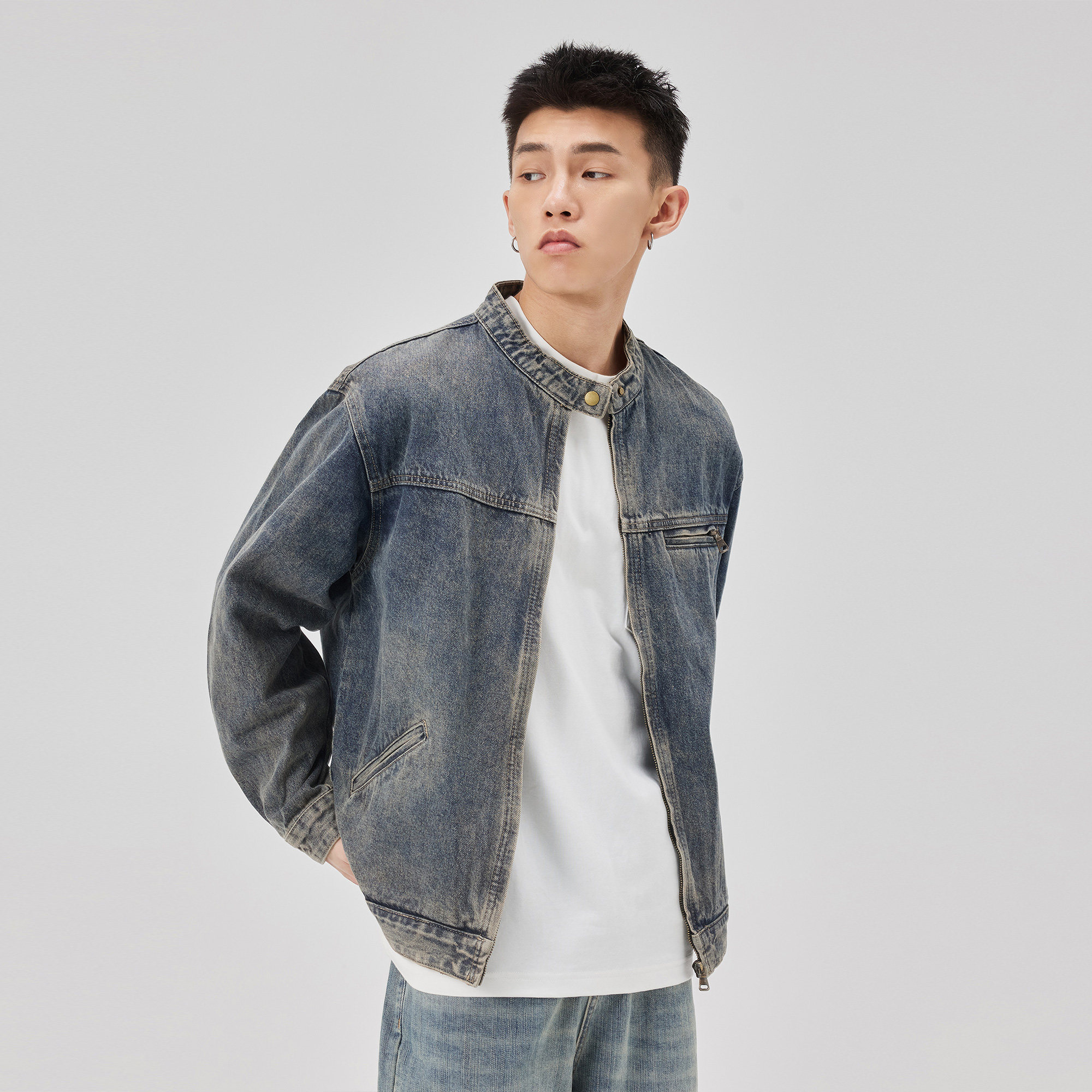 ALLIN 圆领牛仔外套男秋冬季美式高街复古牛仔衣水洗做旧情侣夹克