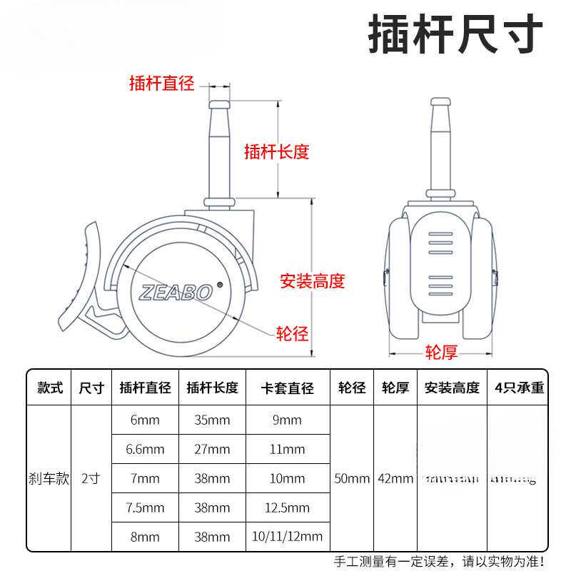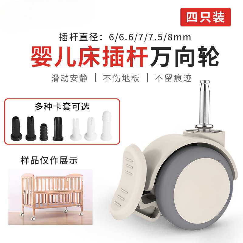 (4只装)婴儿床脚轮插杆轮童床配件万向轮带刹车双轮静音轮子滚轮