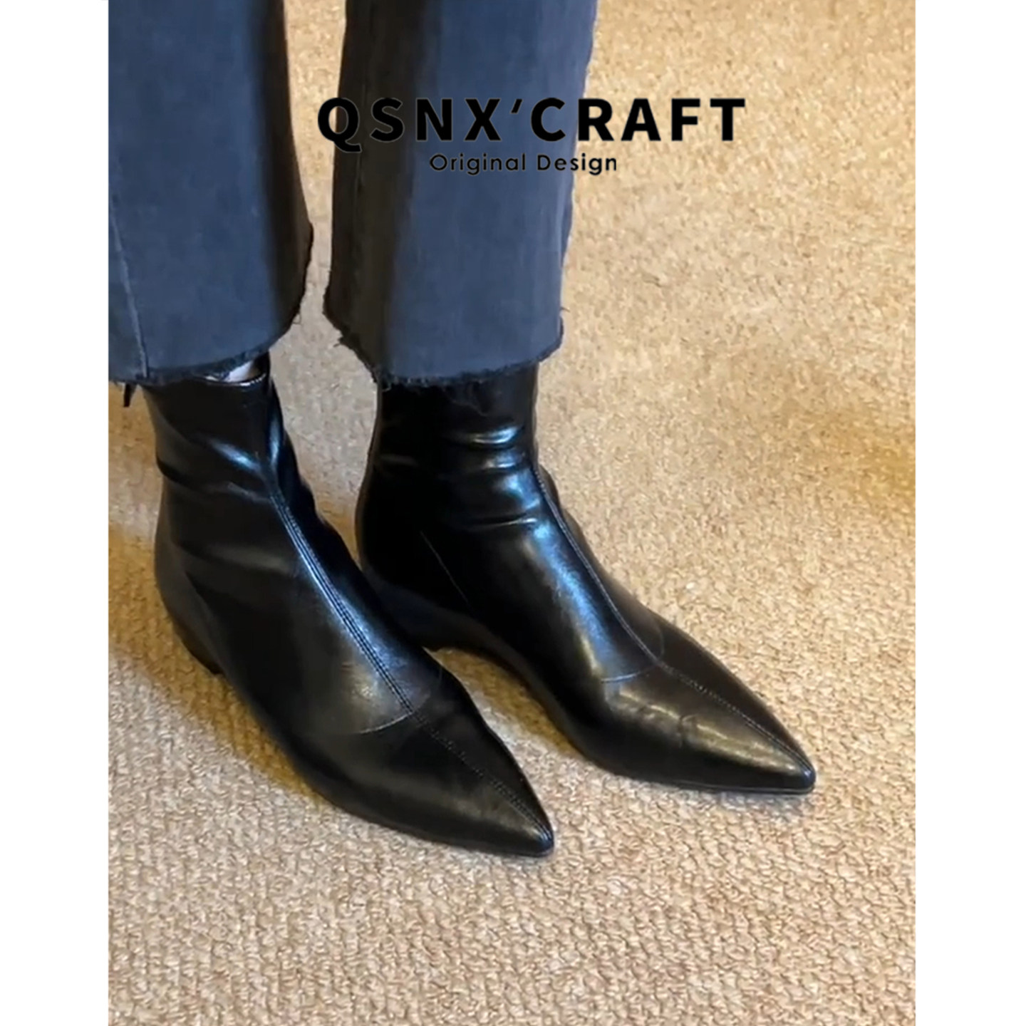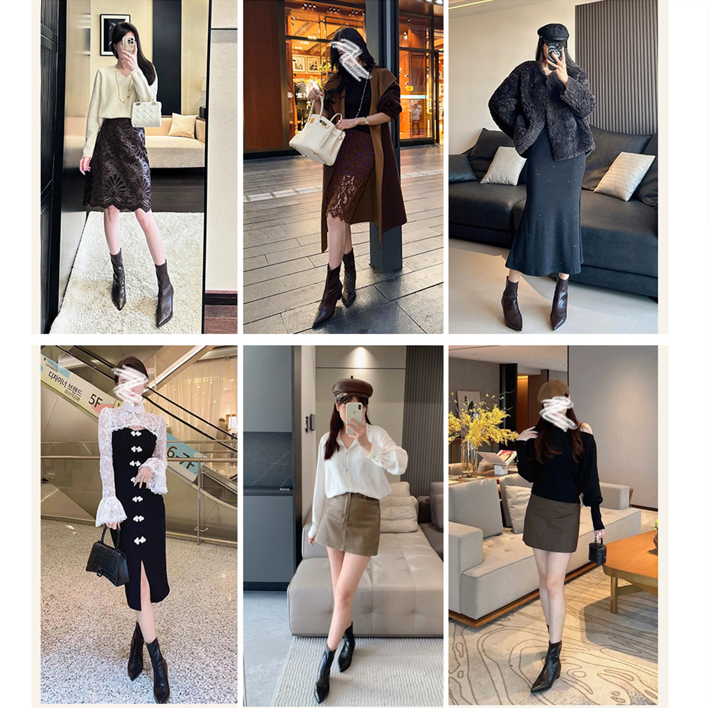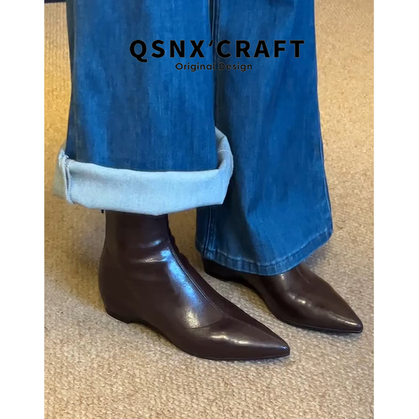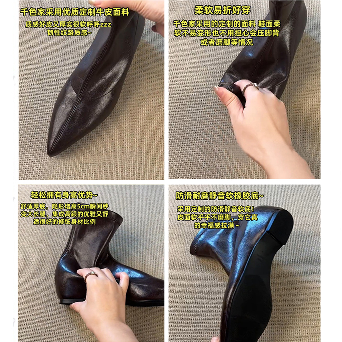 牛皮版~内增高尖头短靴女2025秋冬新款棕色弹力瘦瘦靴小个子靴子