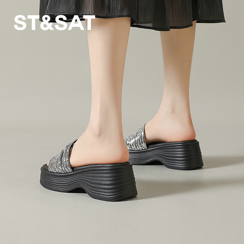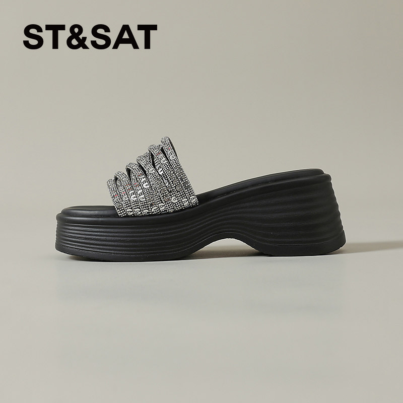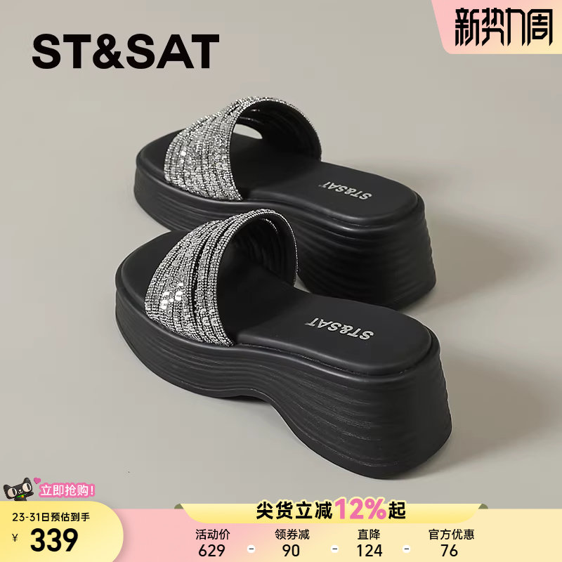 星期六拖鞋女夏外穿厚底一字凉拖2026新款坡跟沙滩鞋水钻露趾松糕
