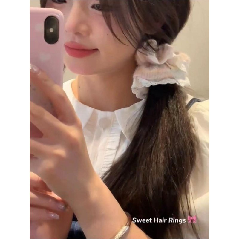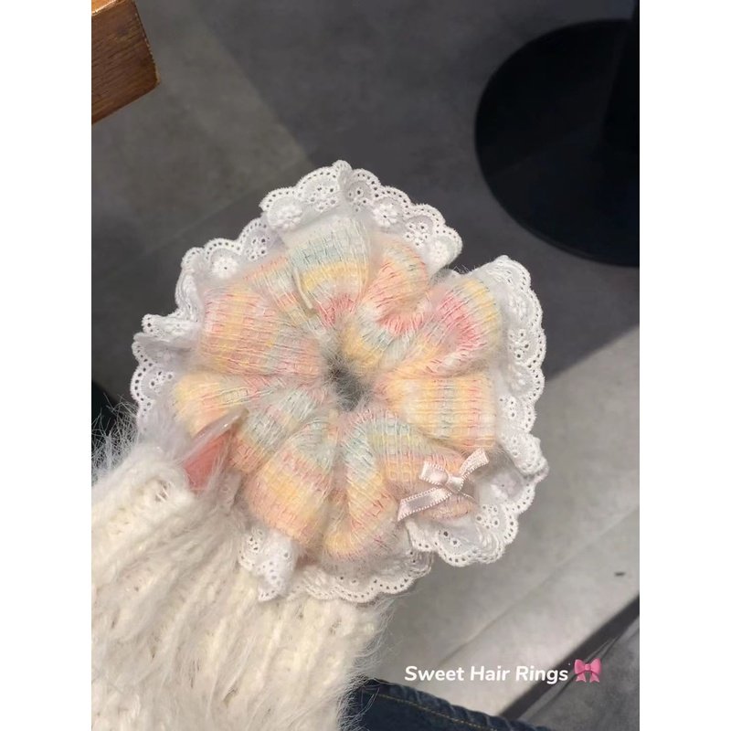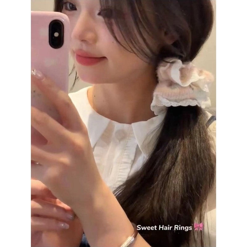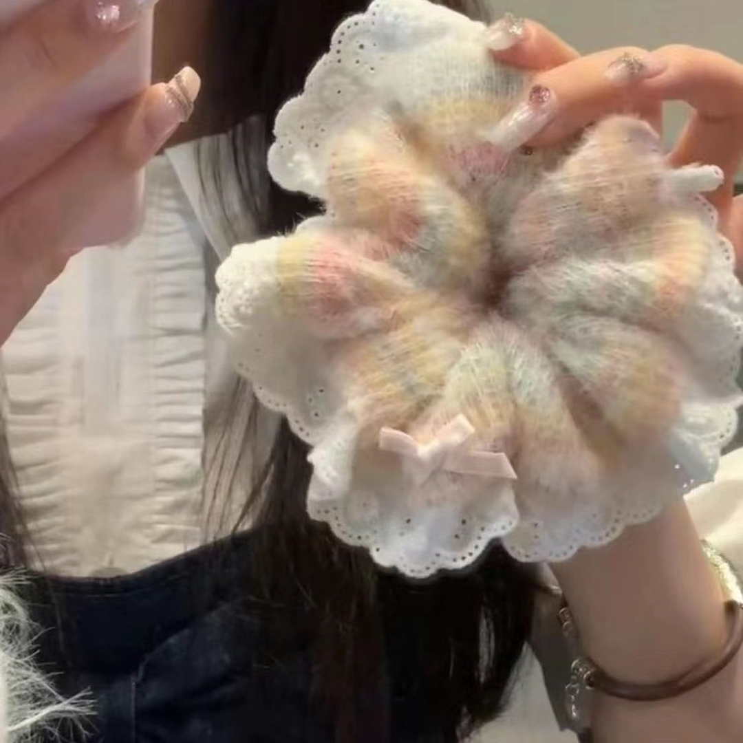 大肠发圈头绳毛绒甜美少女秋冬彩色法式高级蕾丝毛线马尾发绳发饰