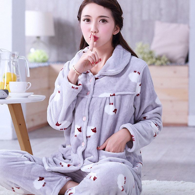 秋冬季法兰绒睡衣女春秋可爱加厚可外穿珊瑚绒套装冬天加绒家居服