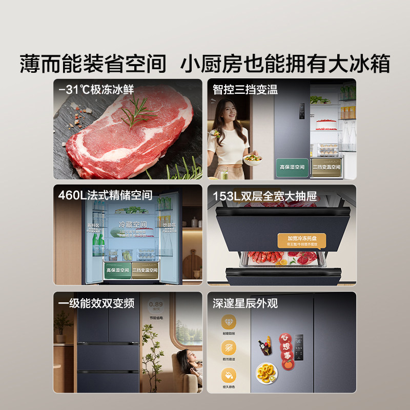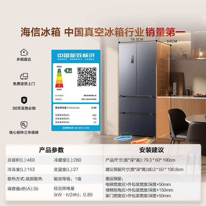 海信460L零嵌入电冰箱法式多四开门超薄家用大容量以旧换新补贴