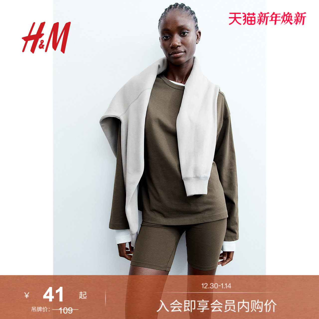 HM女装T恤冬季时尚休闲简约长袖圆领棉质宽松打底衫上衣1243660