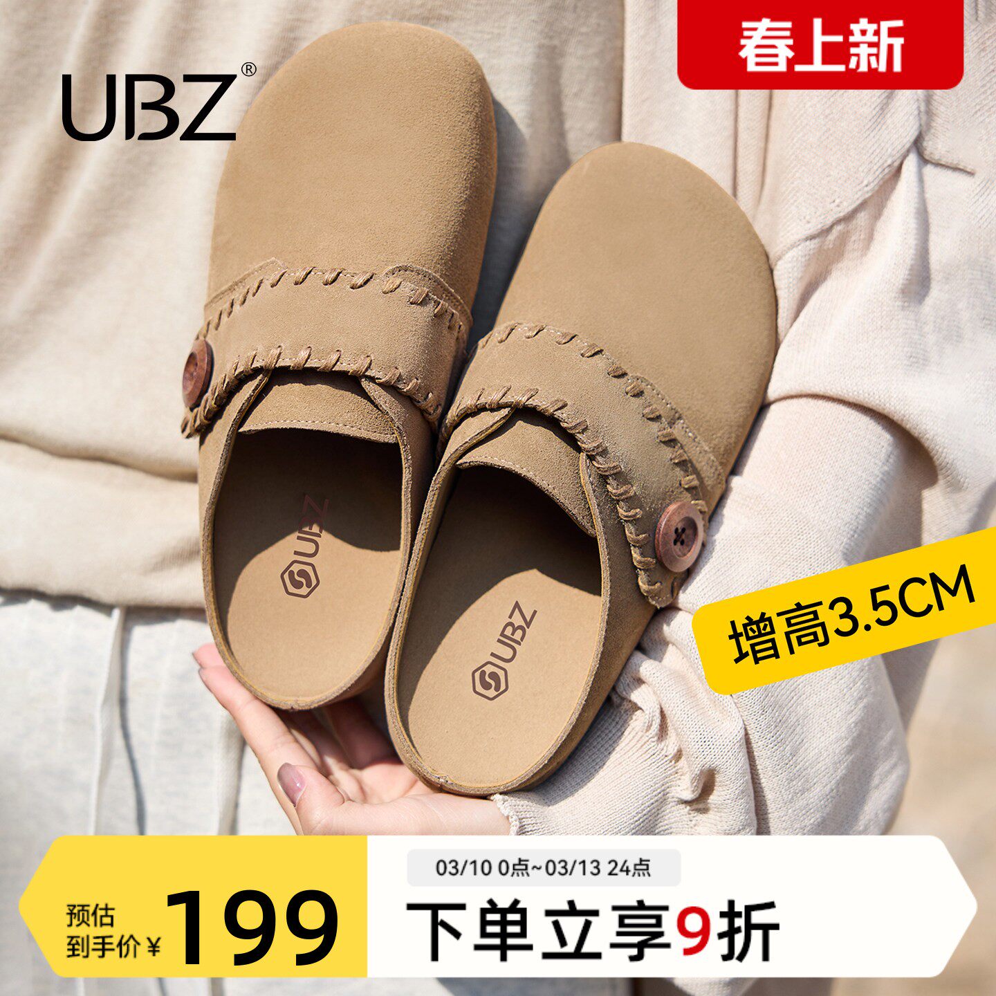 UBZ 防水内增高厚底勃肯半拖女2026春新款包头真皮懒人单鞋博肯鞋