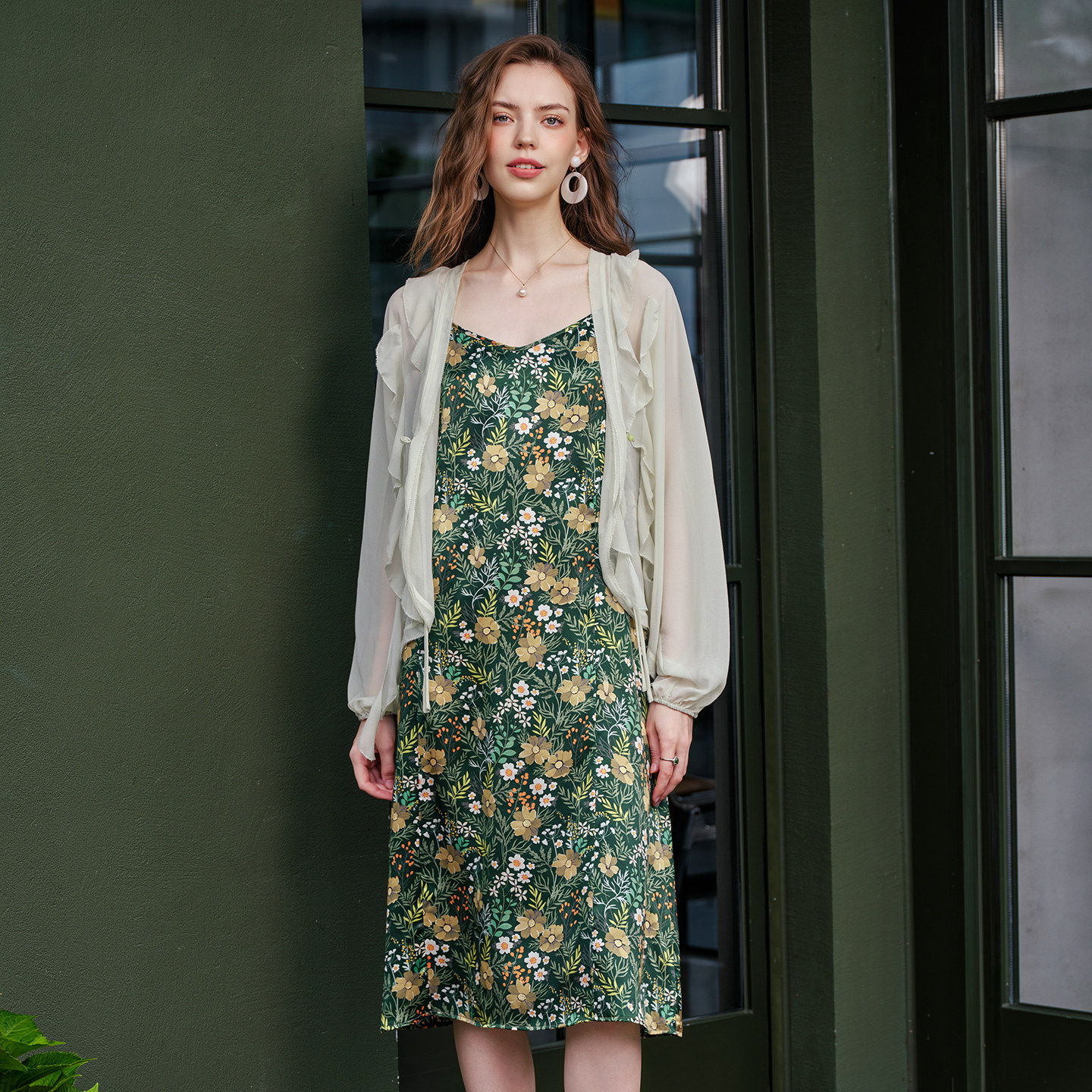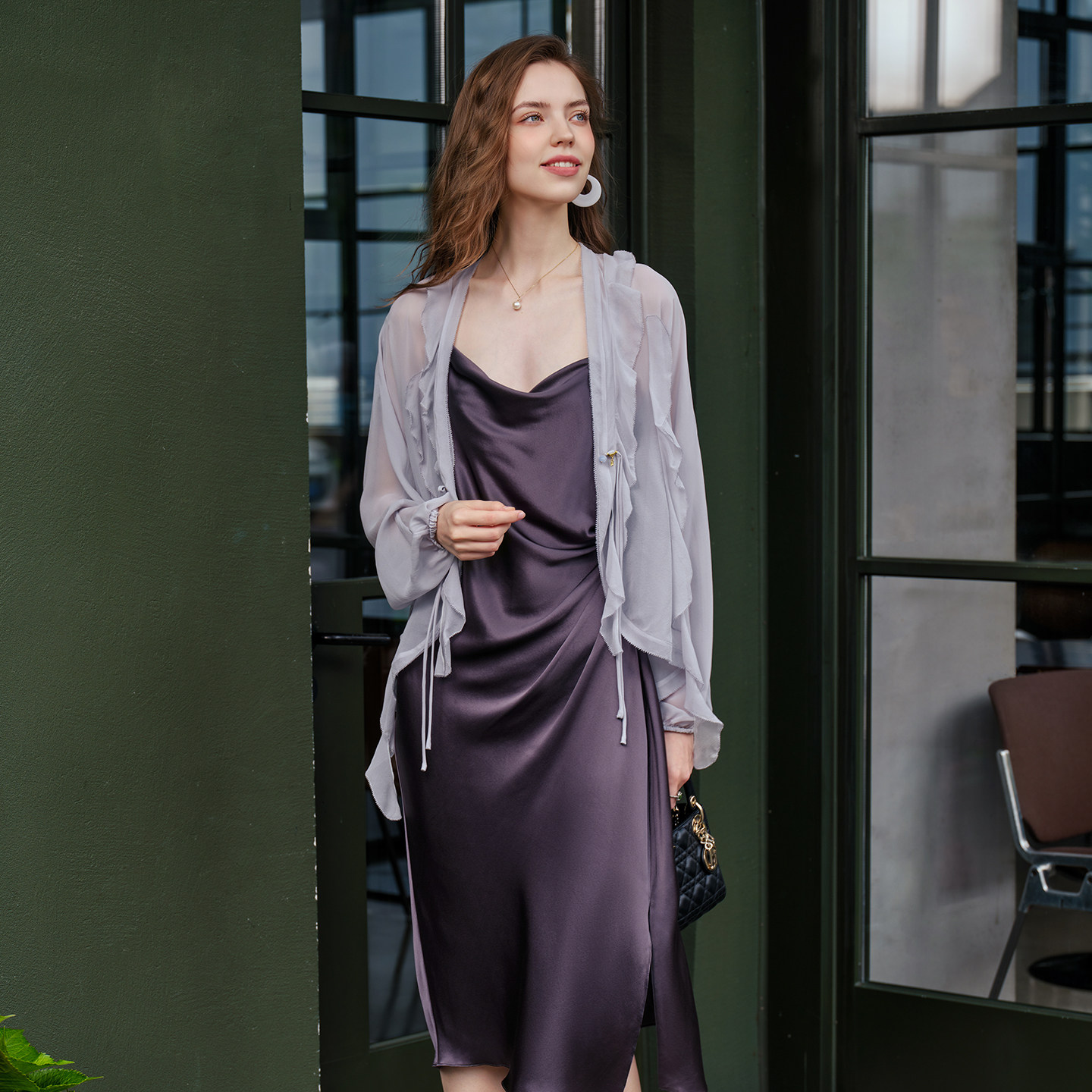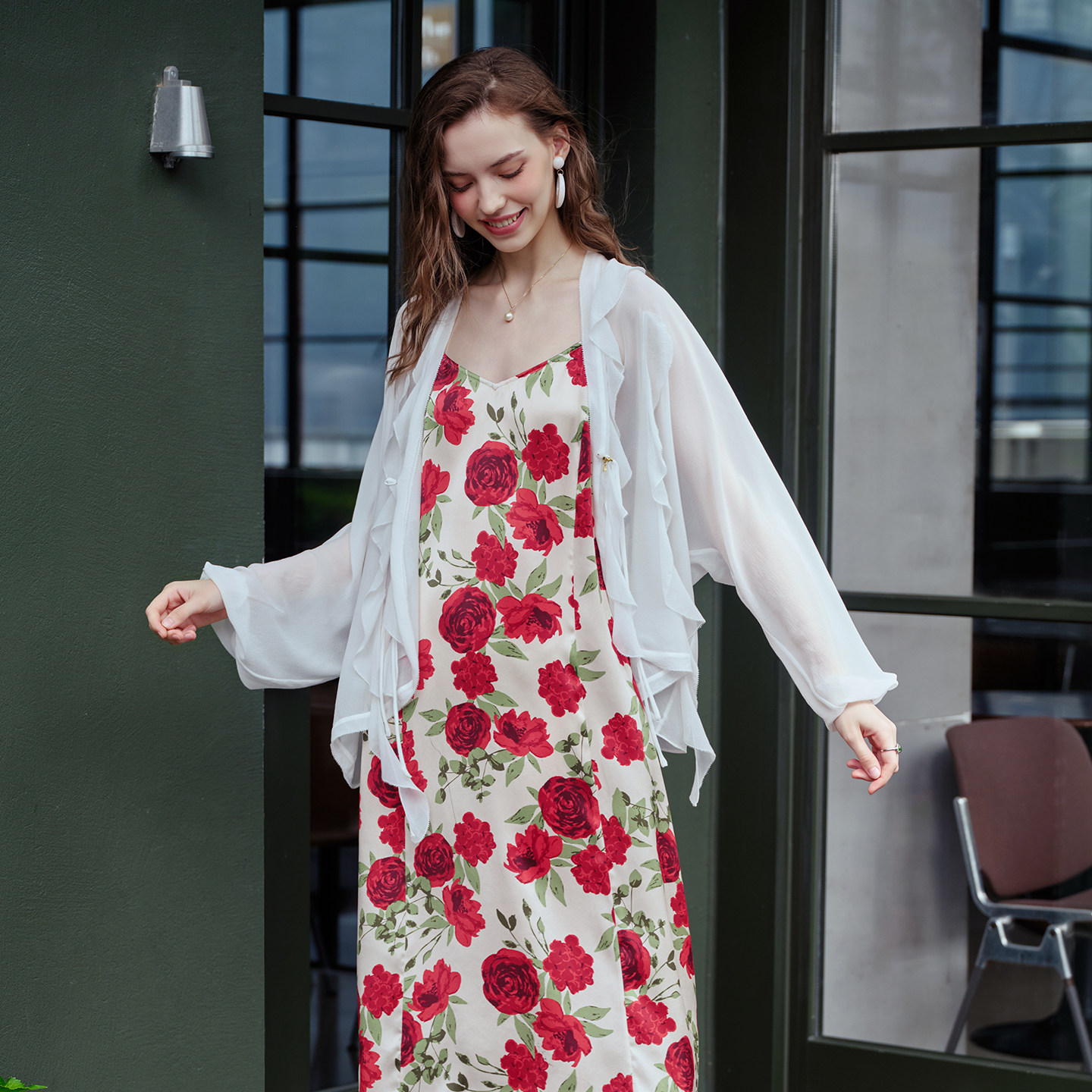 美标女士春夏长袖外搭上衣对丝荷叶边飘带雪纺衫薄款遮阳开衫披肩