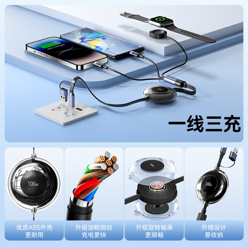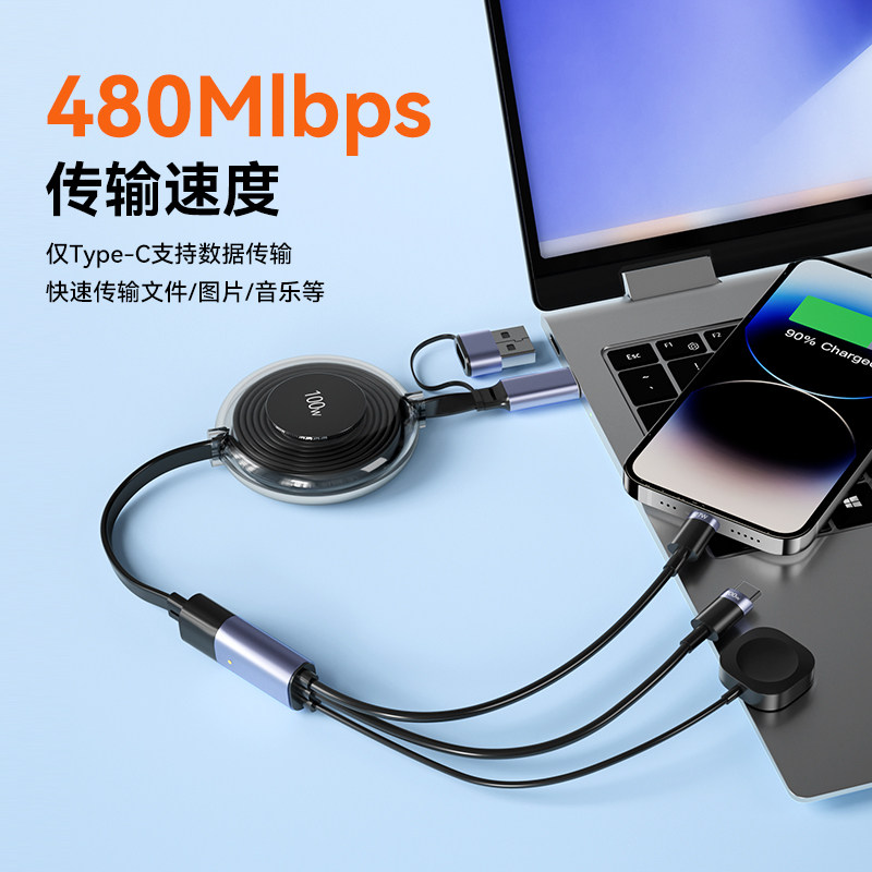 倍思三合一数据线typec充电线100w快充线一拖三适用苹果华为PD20W安卓MacBook笔记本电脑伸缩多头多功能通用