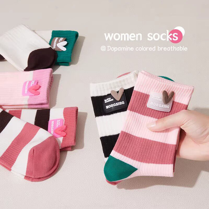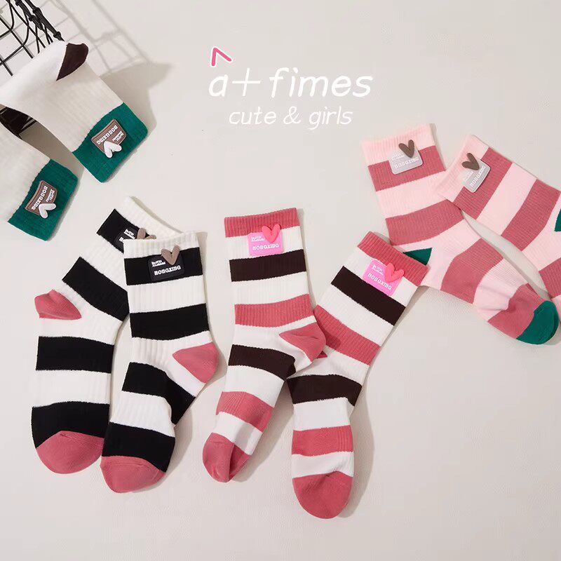 多巴胺女童袜子秋冬纯棉中筒儿童韩版彩虹条纹拼色春秋潮袜无骨袜