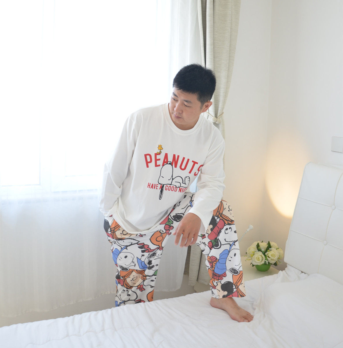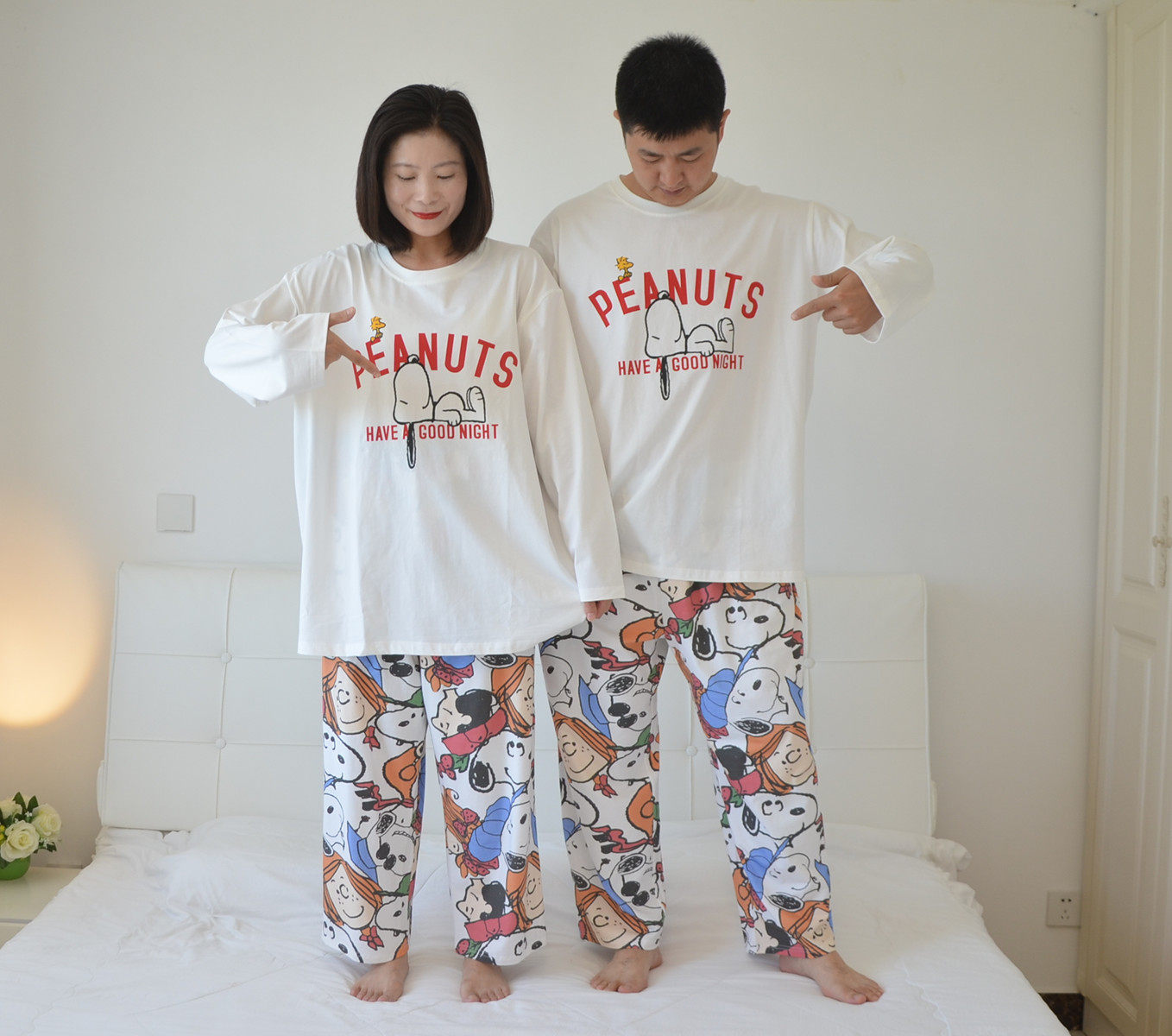 安比斯情侣睡衣舒适纯棉秋季女长袖男女同款休闲家居服套装可出门