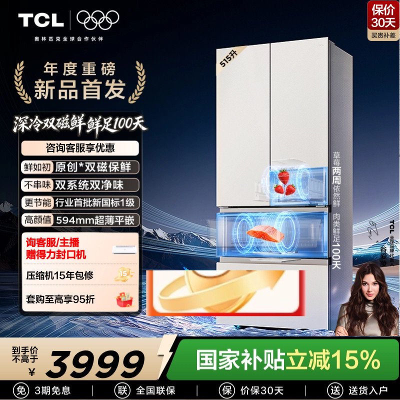 TCL 双磁鲜515升法式多门深冷磁鲜双系统双净味零嵌冰箱新一级