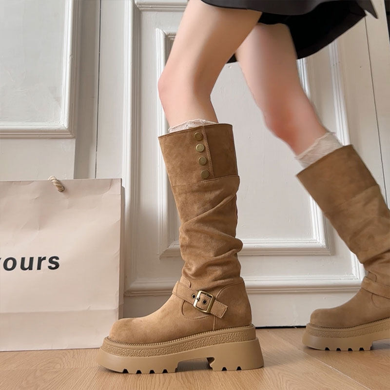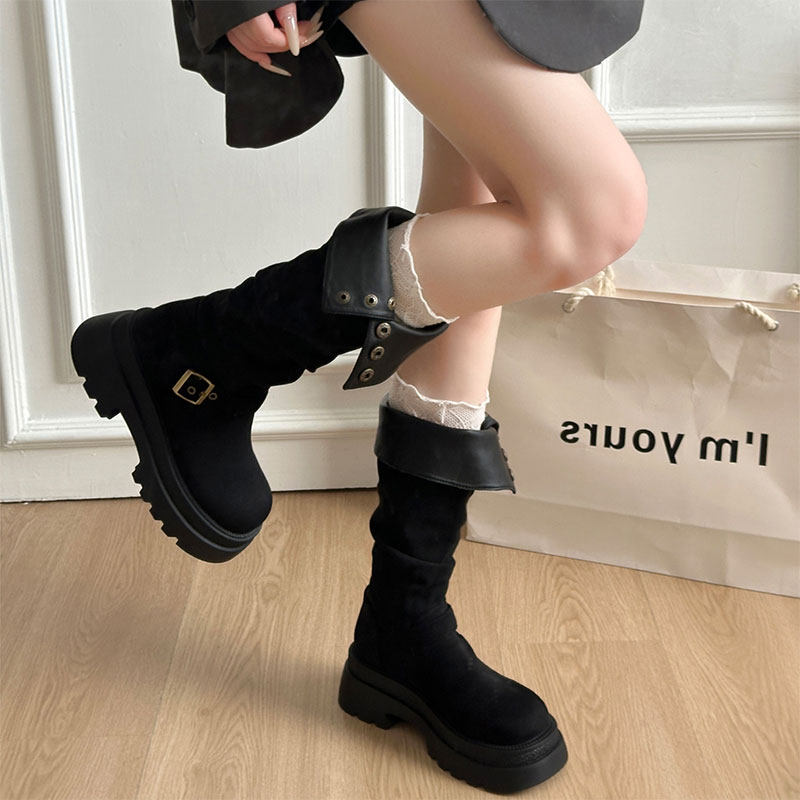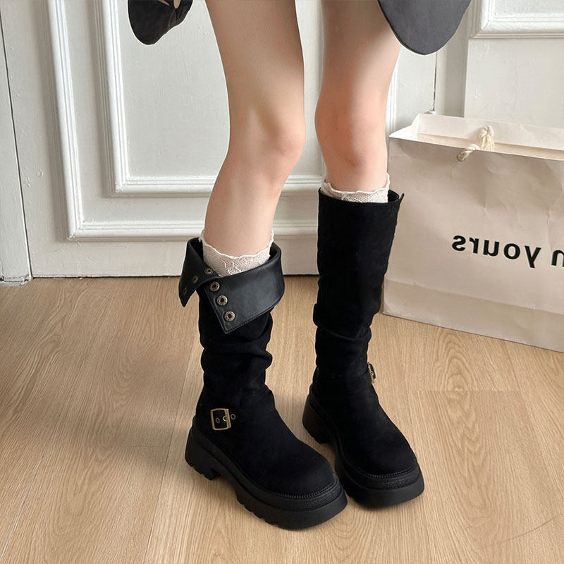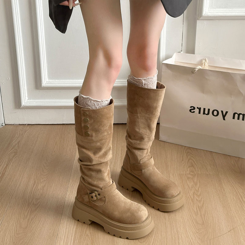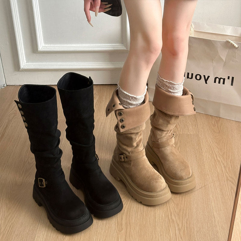 两穿不过膝长筒靴子女2025秋冬新款厚底绒面粗跟堆堆靴增高骑士靴