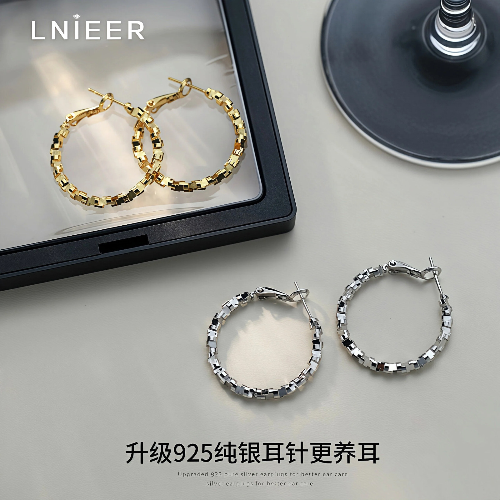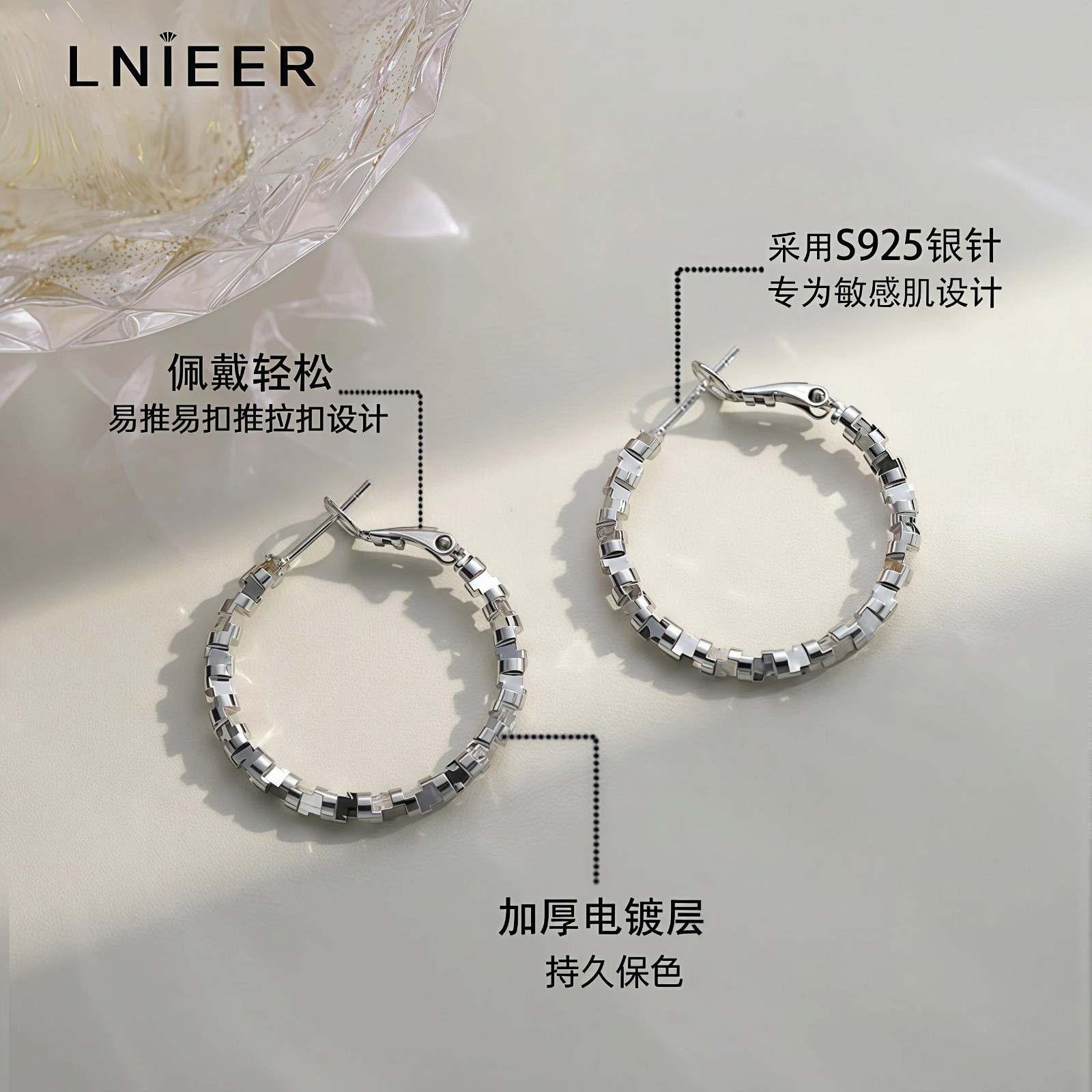 S925纯银针耳圈碎银子素圈耳环女耳扣2025新款爆款方圆脸耳饰高级