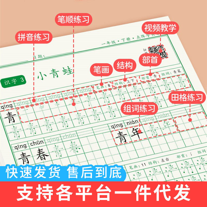 练字帖小学生专用一二三年级语文上下册同步汉字控笔点阵生字描红