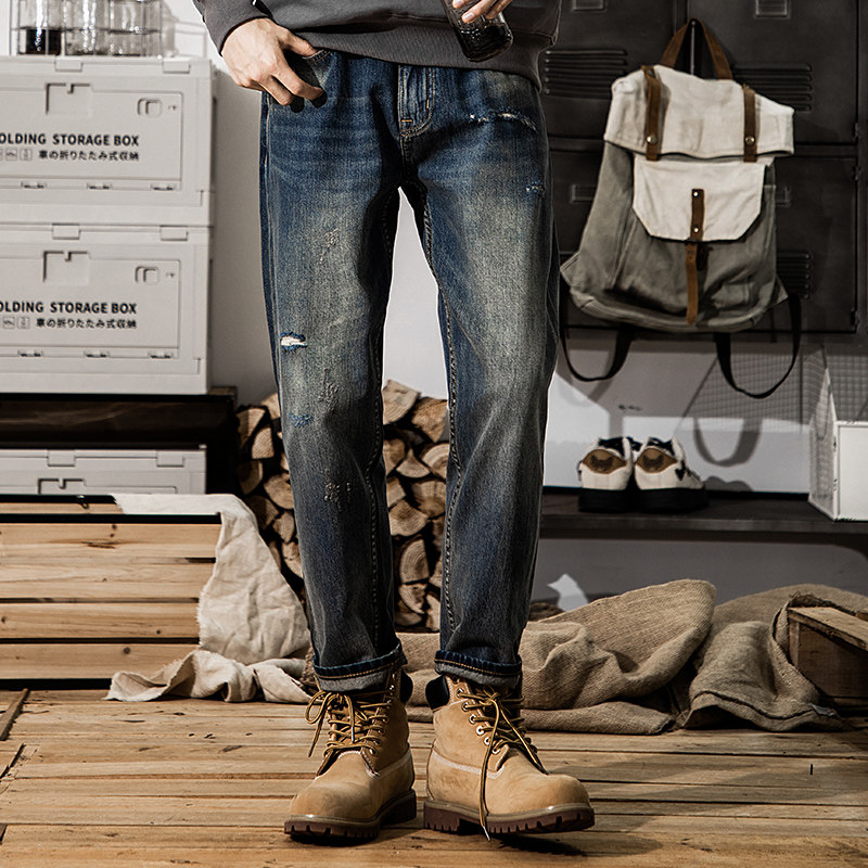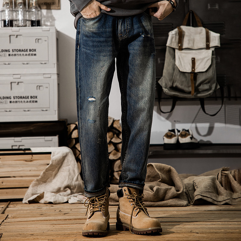 2025年冬季新款美式复古水洗破洞赤耳丹宁牛仔裤男锥形小脚九分