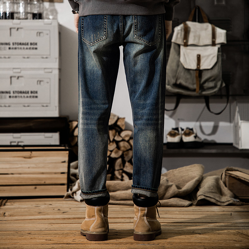 吉普专柜秋冬季新款复古牛仔裤男宽松直筒大码加绒加厚水洗长裤子