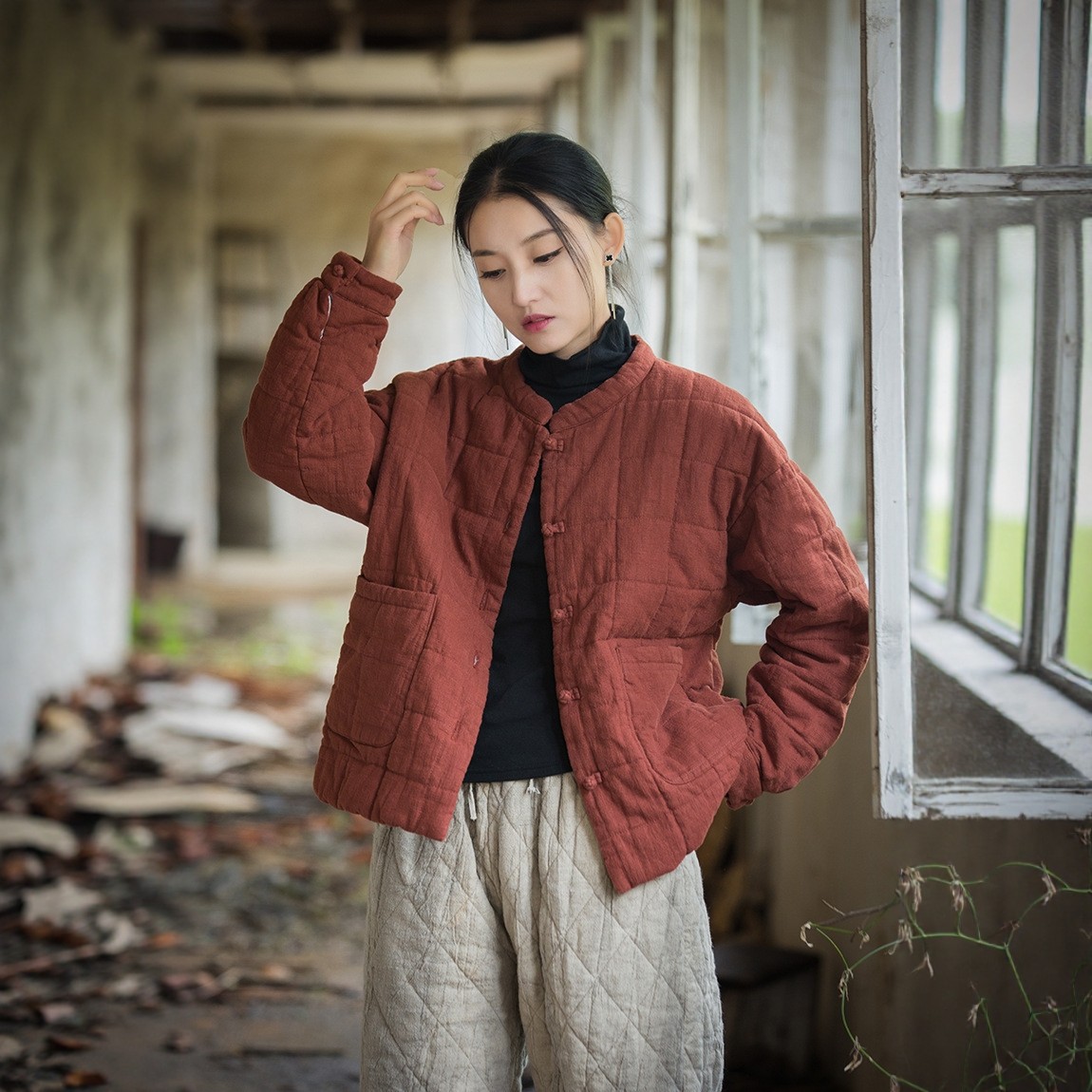 25冬季新款女装苎麻夹棉绗缝方格棉袄棉服时尚文艺个性女式短棉衣