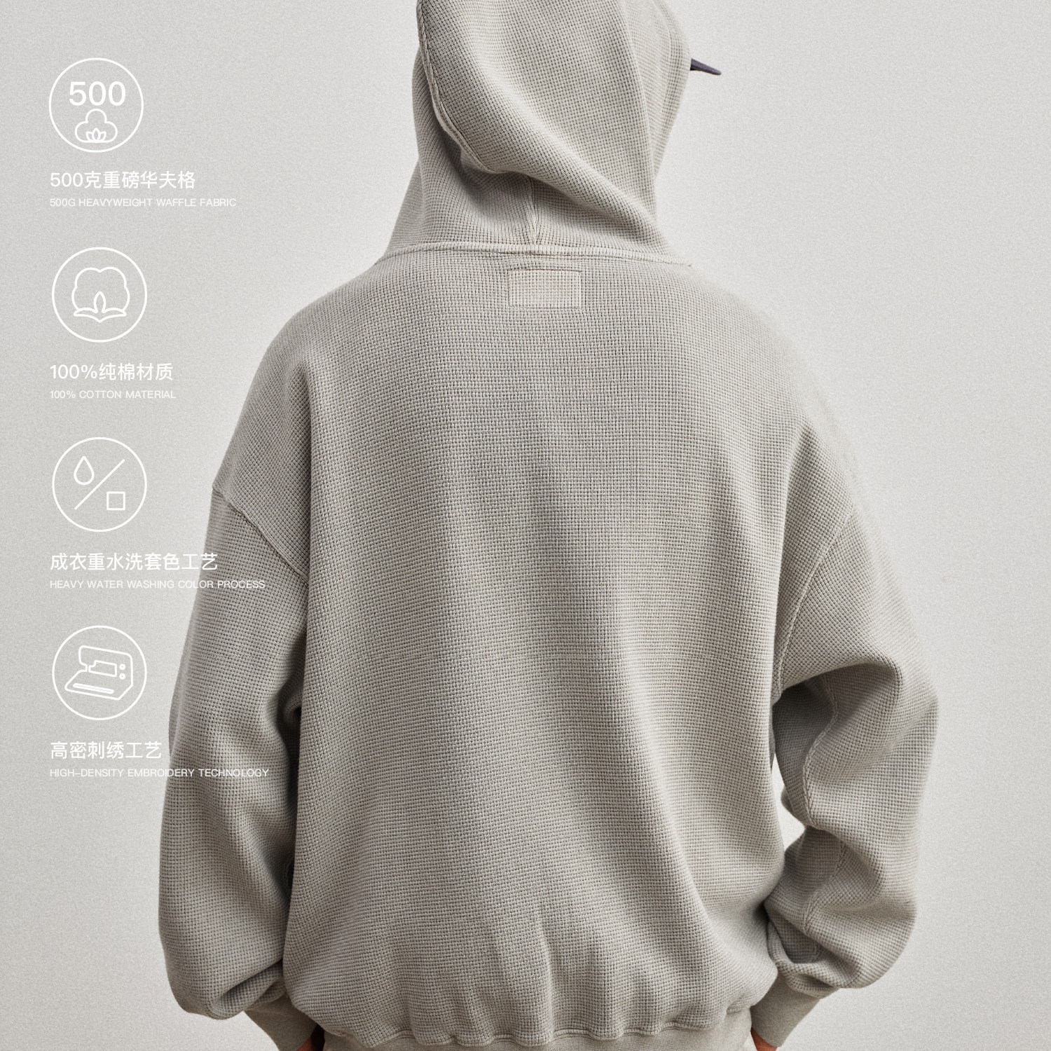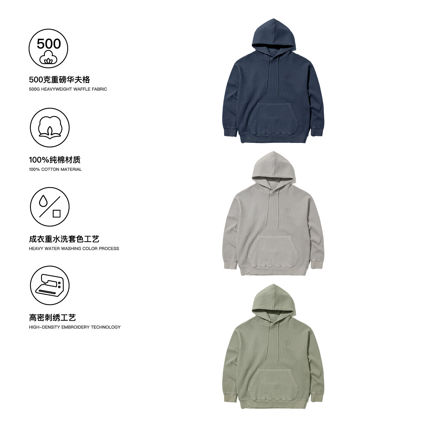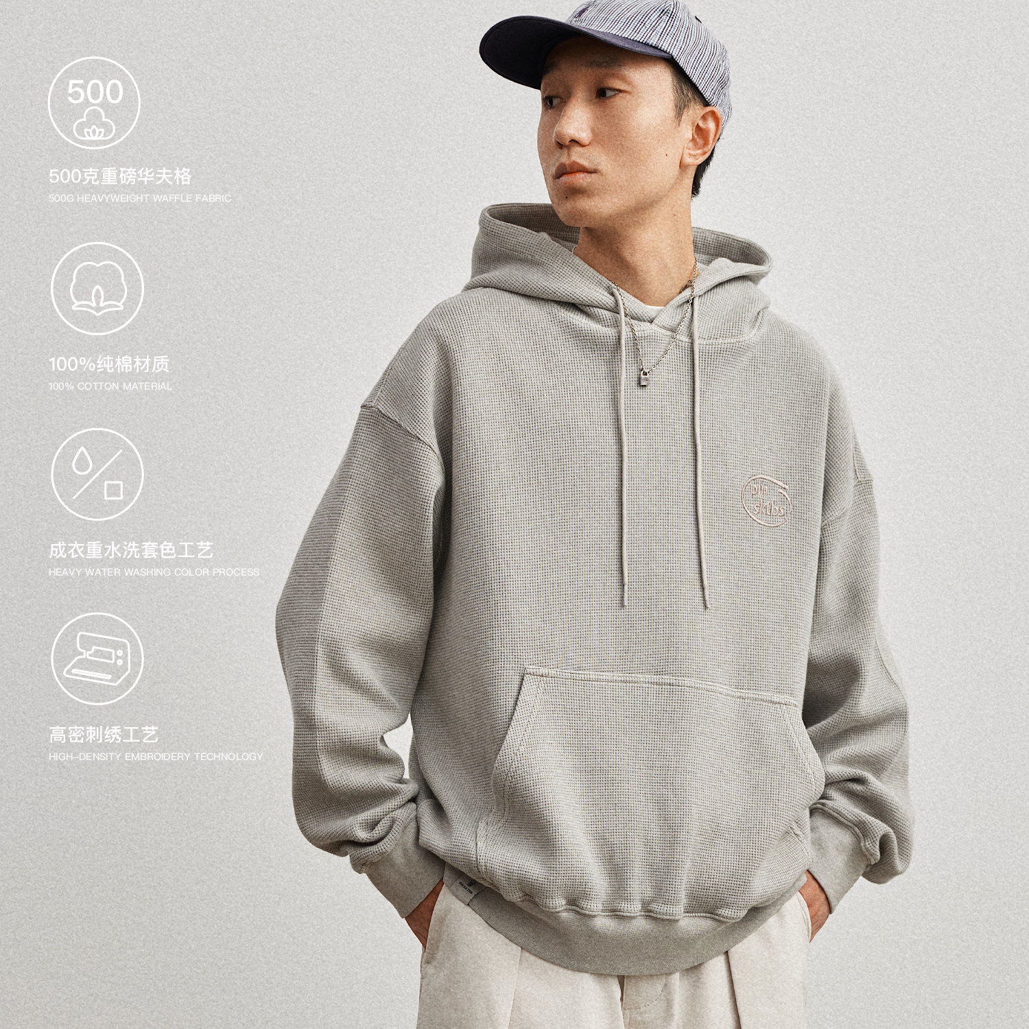 PINSKTBS 春秋日系复古休闲宽松简约重磅水洗华夫格连帽套头卫衣