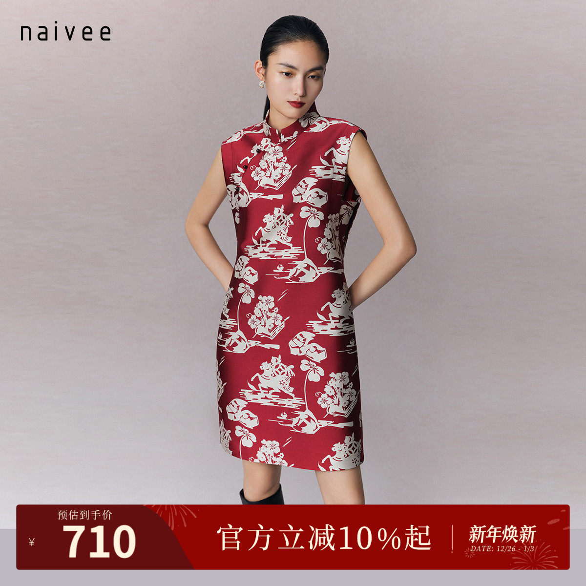 【马上有钱花旗袍裙】naivee25冬新款红色节日婚宴色织提花连衣裙