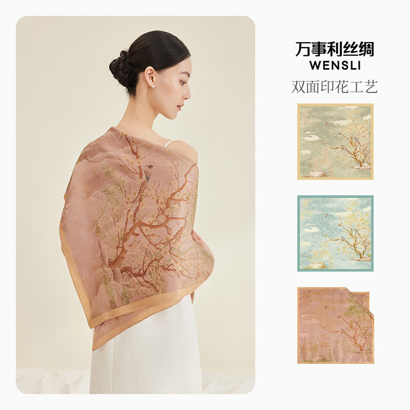 万事利新款100%桑蚕丝真丝丝巾女节日礼物重磅19姆米大方巾雀枝锦
