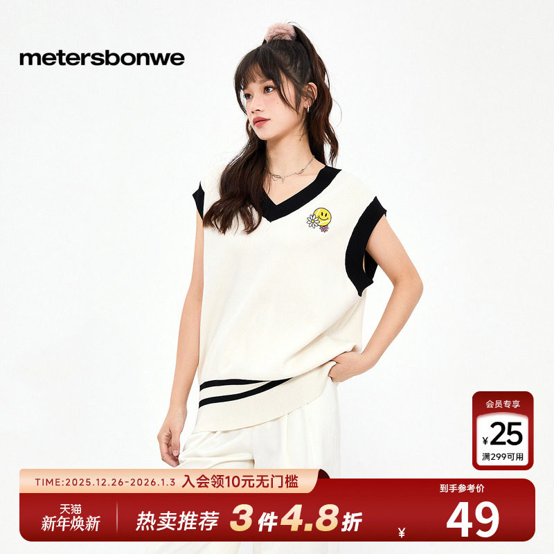美特斯邦威马甲女秋季新款学院甜美v领卡通可爱印花宽松针织上衣
