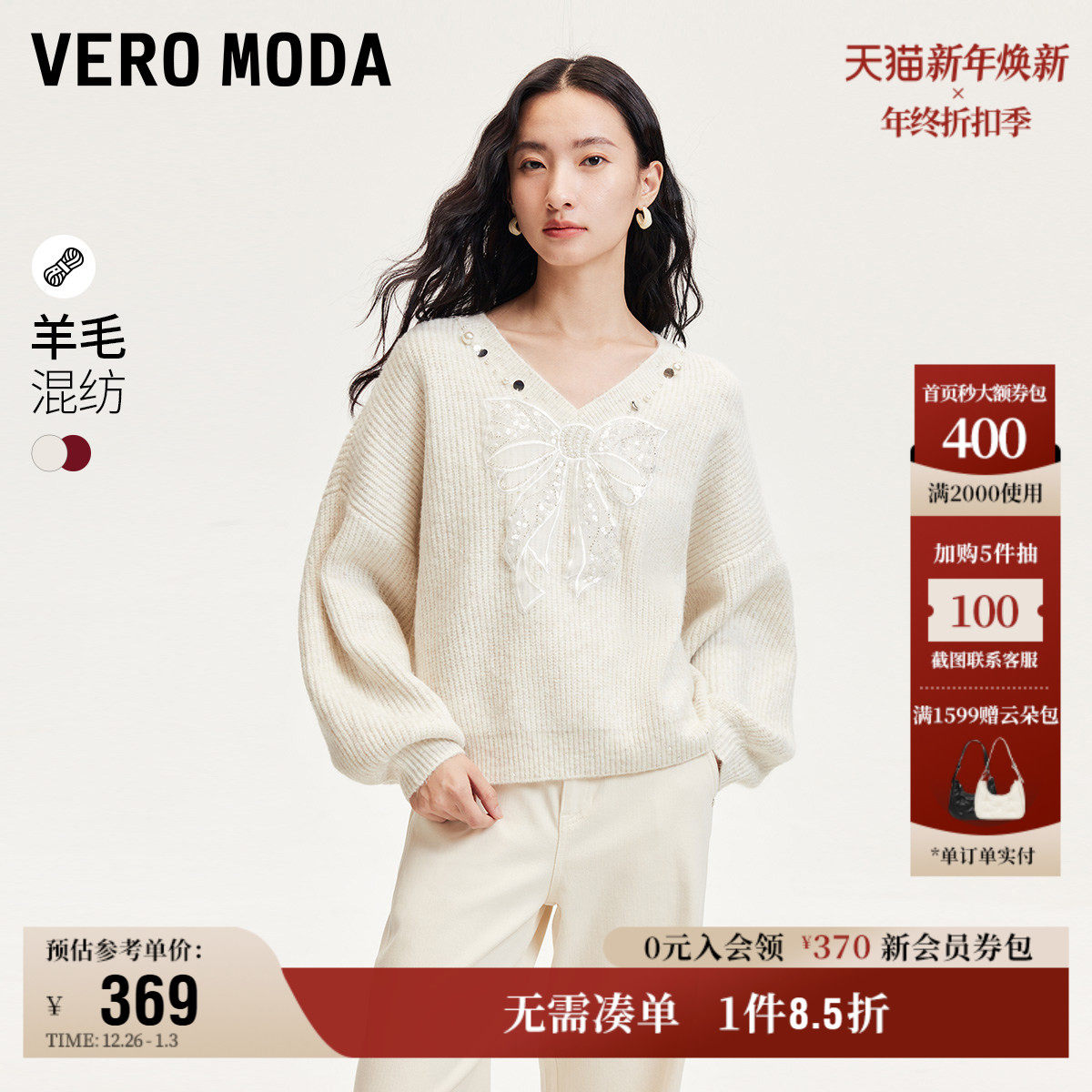 Vero Moda奥莱针织衫女秋冬新款蝴蝶结亮片V领宽松气质甜美毛衣