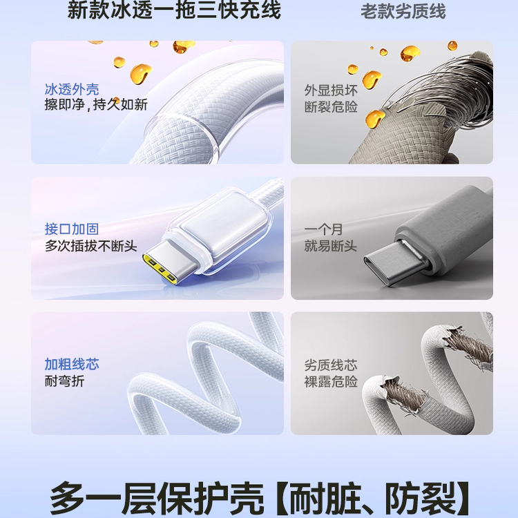 第一卫数据线三合一充电器线超级快充一拖三100W适用苹果华为小米安卓typec车载三线合一多功能USB-A充电传输