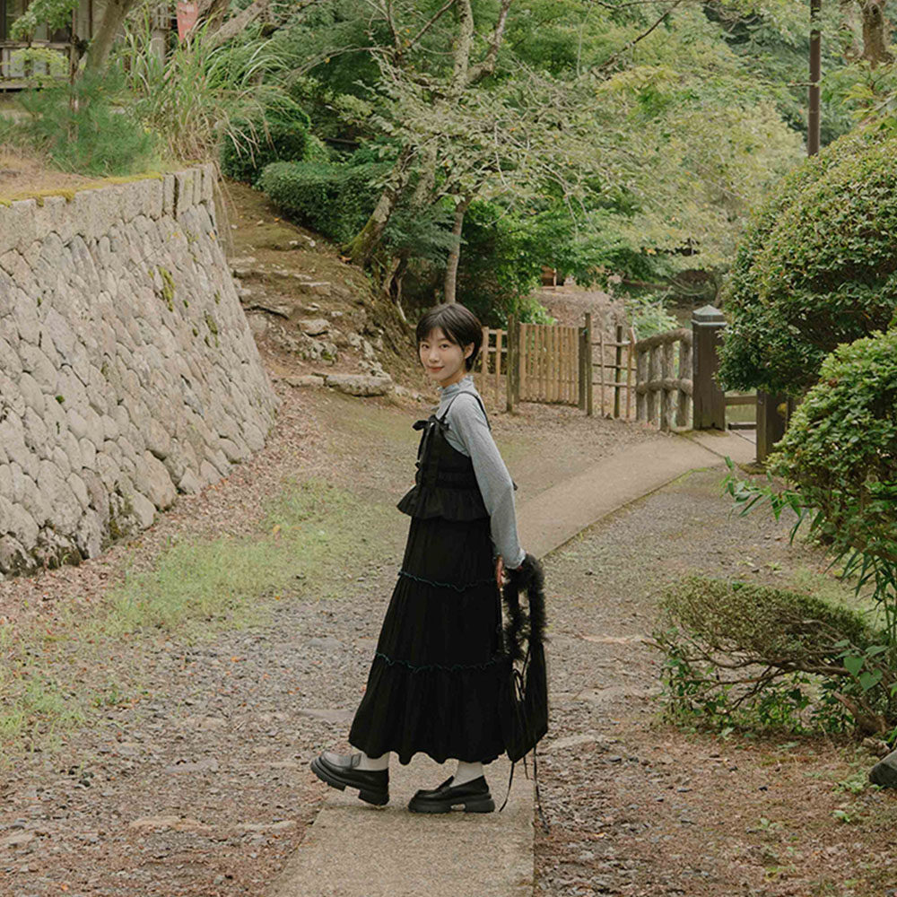 QUEENSHOP 2025秋冬新品女装配色木耳边细褶造型长连衣裙01087138