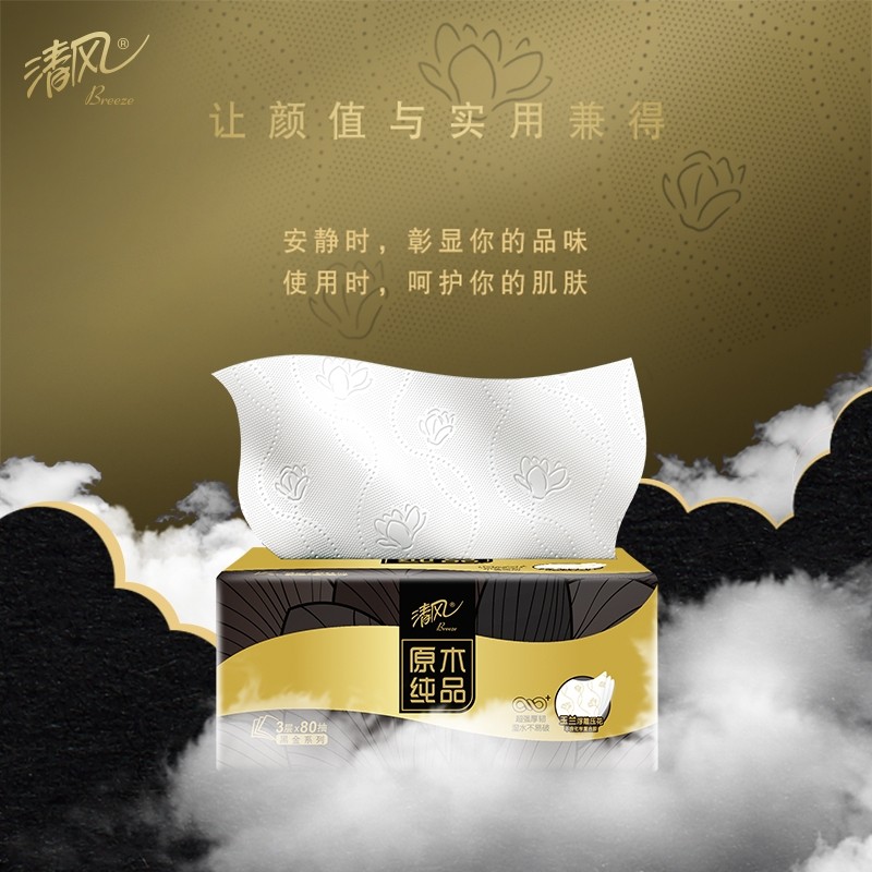 清风印花抽纸3层加厚黑金纸巾家用实惠装餐巾纸卫生纸整箱装纸抽