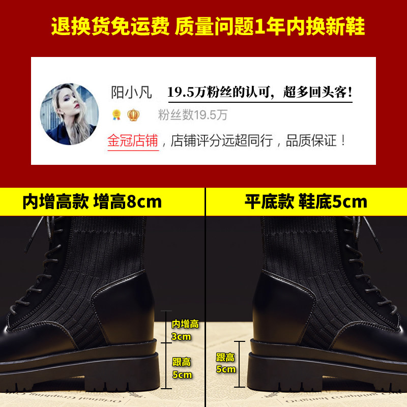 内增高马丁靴女小个子春秋单靴厚底显瘦弹力冬季加绒英伦真皮短靴