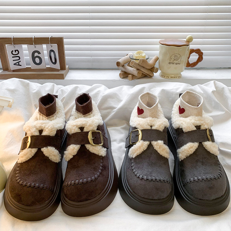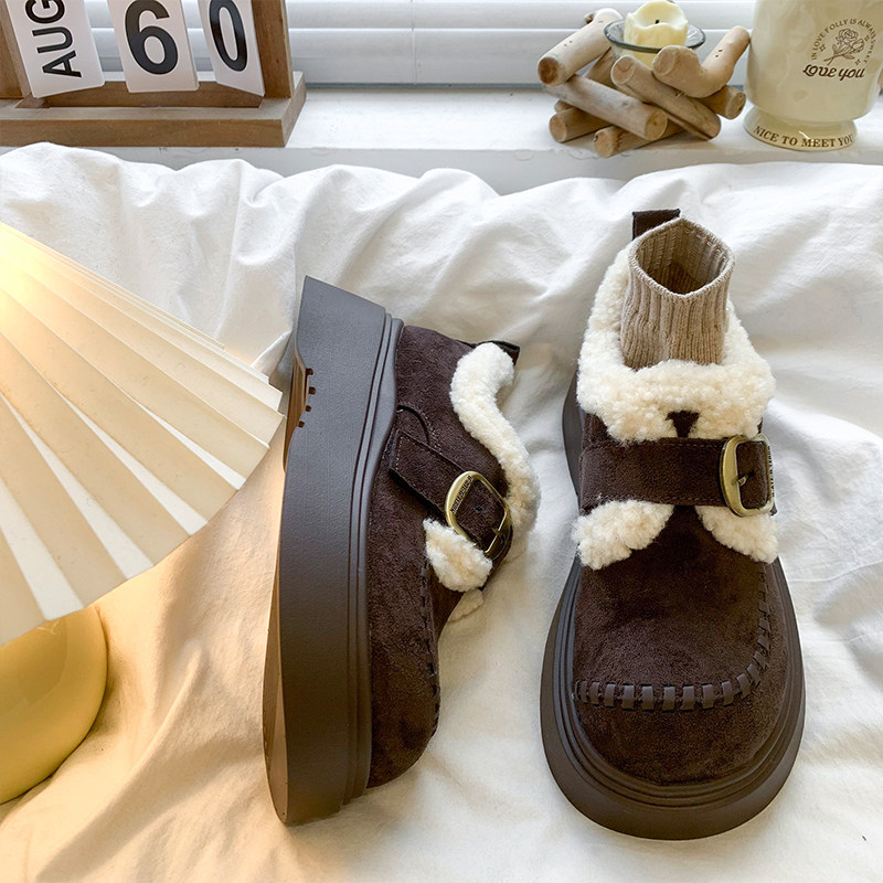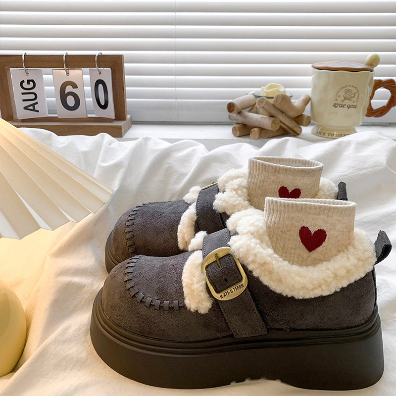 厚底加绒棉鞋女2025秋冬保暖毛毛雪地靴小皮鞋灰色毛绒高筒圆头