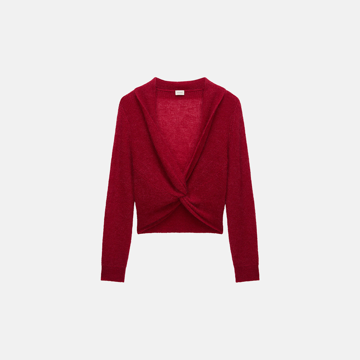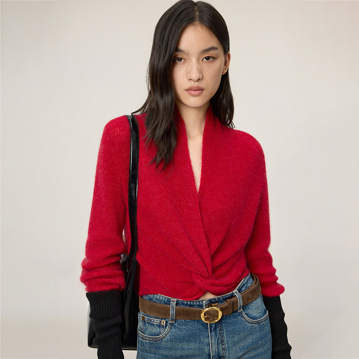 【新品】OCHIRLY欧时力 羊毛交叉扭结V领针织毛衣轻薄红色2026春