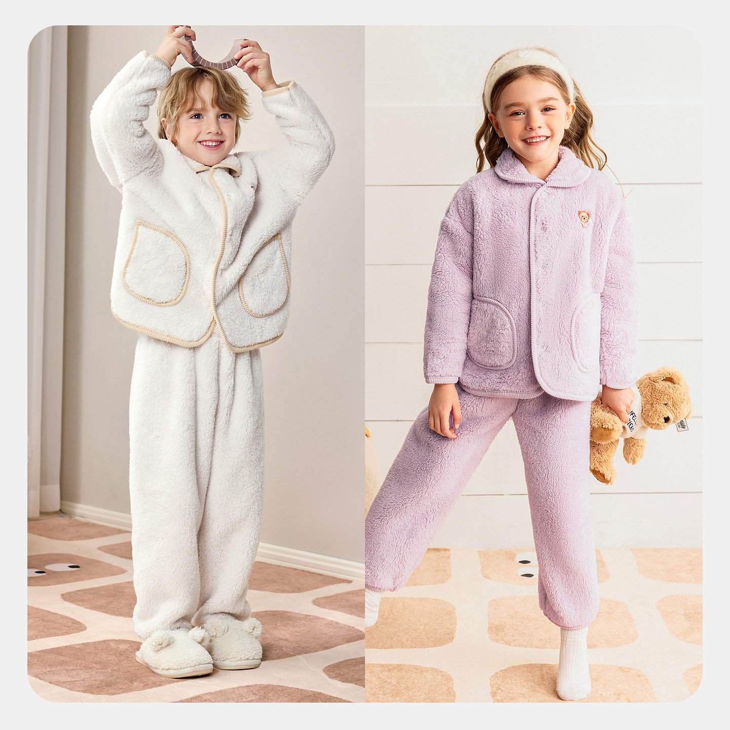 小黑托昵男女童连帽睡衣套装半边绒儿童家居服冬款加绒加厚空调服