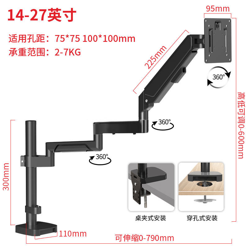 三节加长拉伸79㎝倒挂书柜显示器支架俯仰旋转升降床边架万向通用