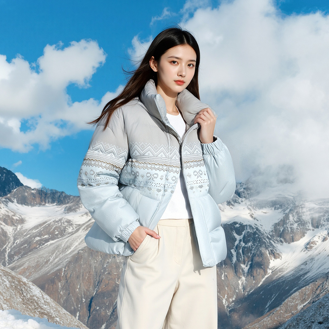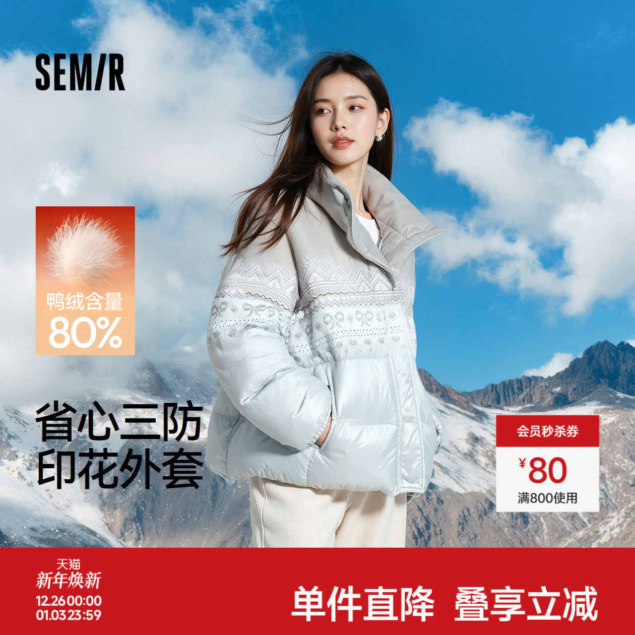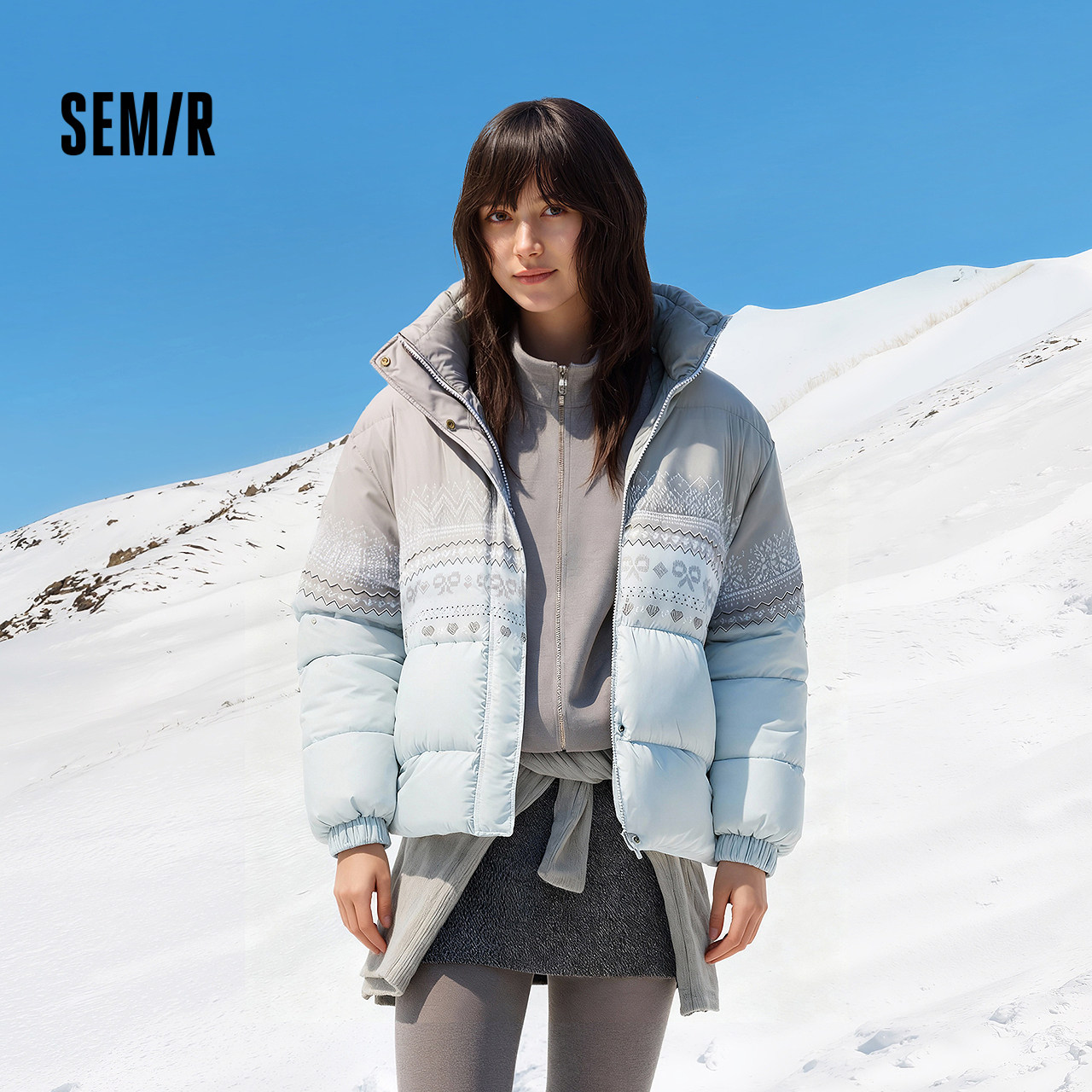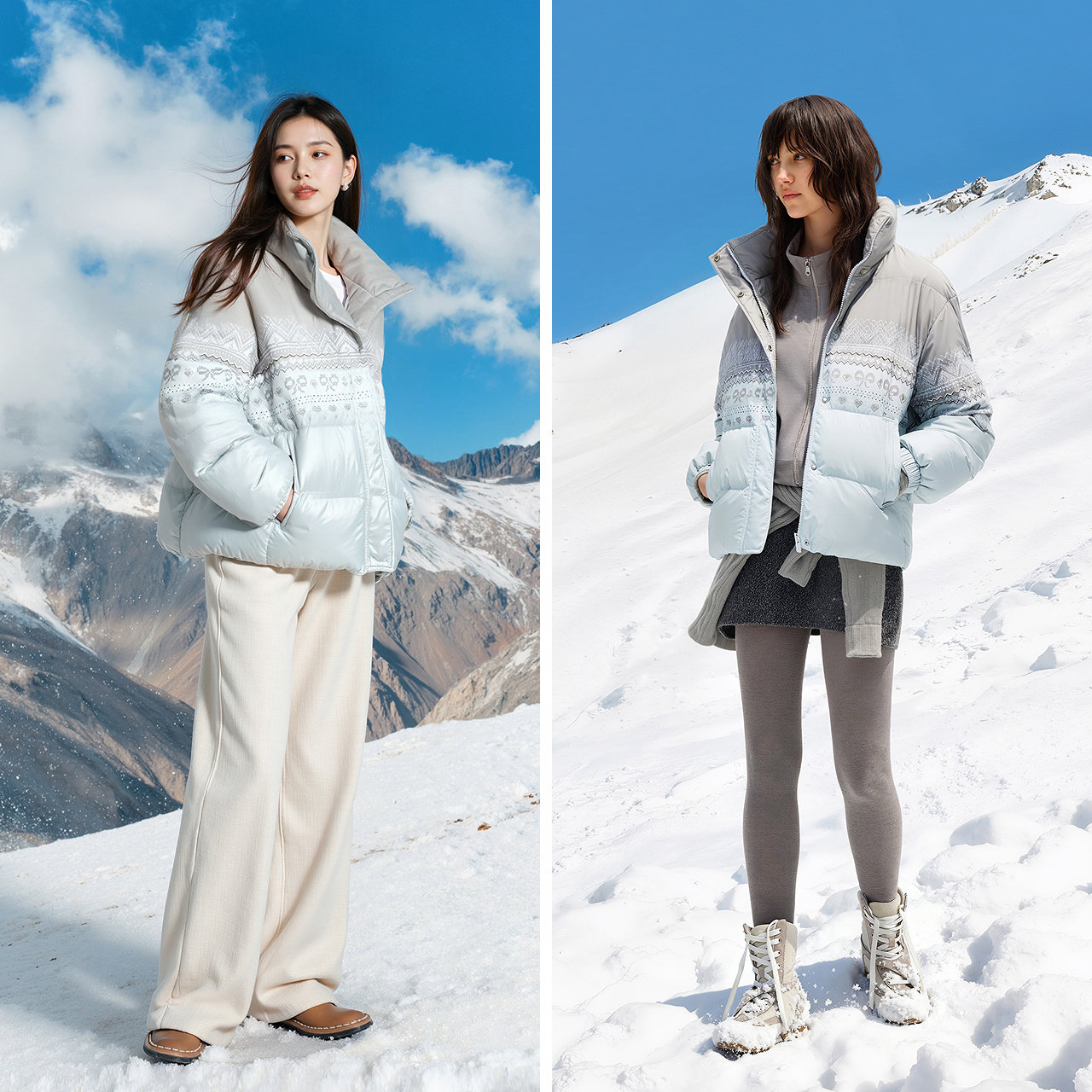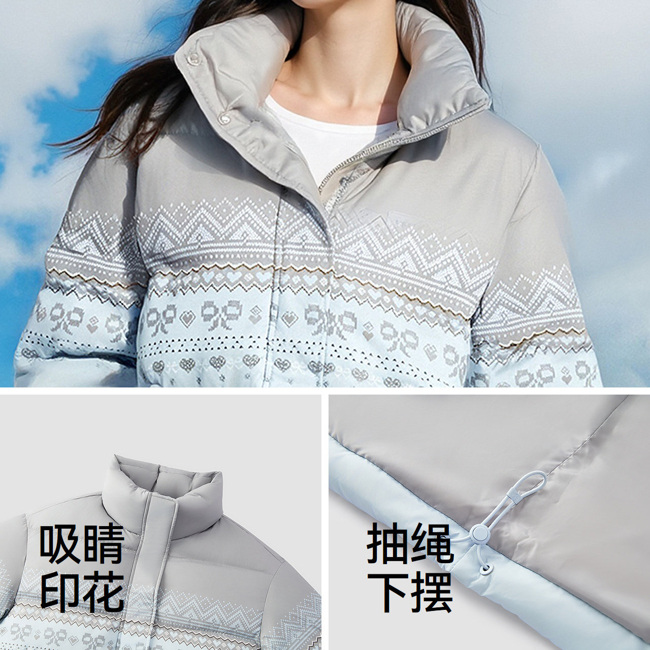 森马羽绒服女冬三防费尔岛印花80绒子宽松2025新款甜美设计感上衣