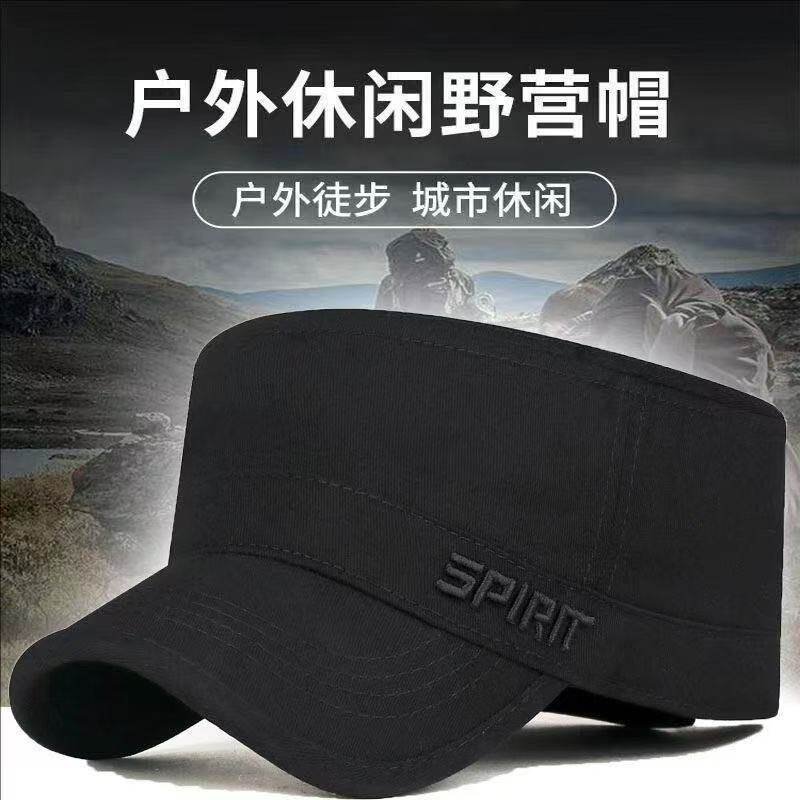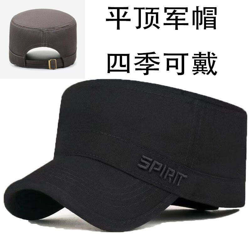 四季平顶调节新款鸭舌帽纯棉休闲出游帽子刺绣男士中老年春秋黑色