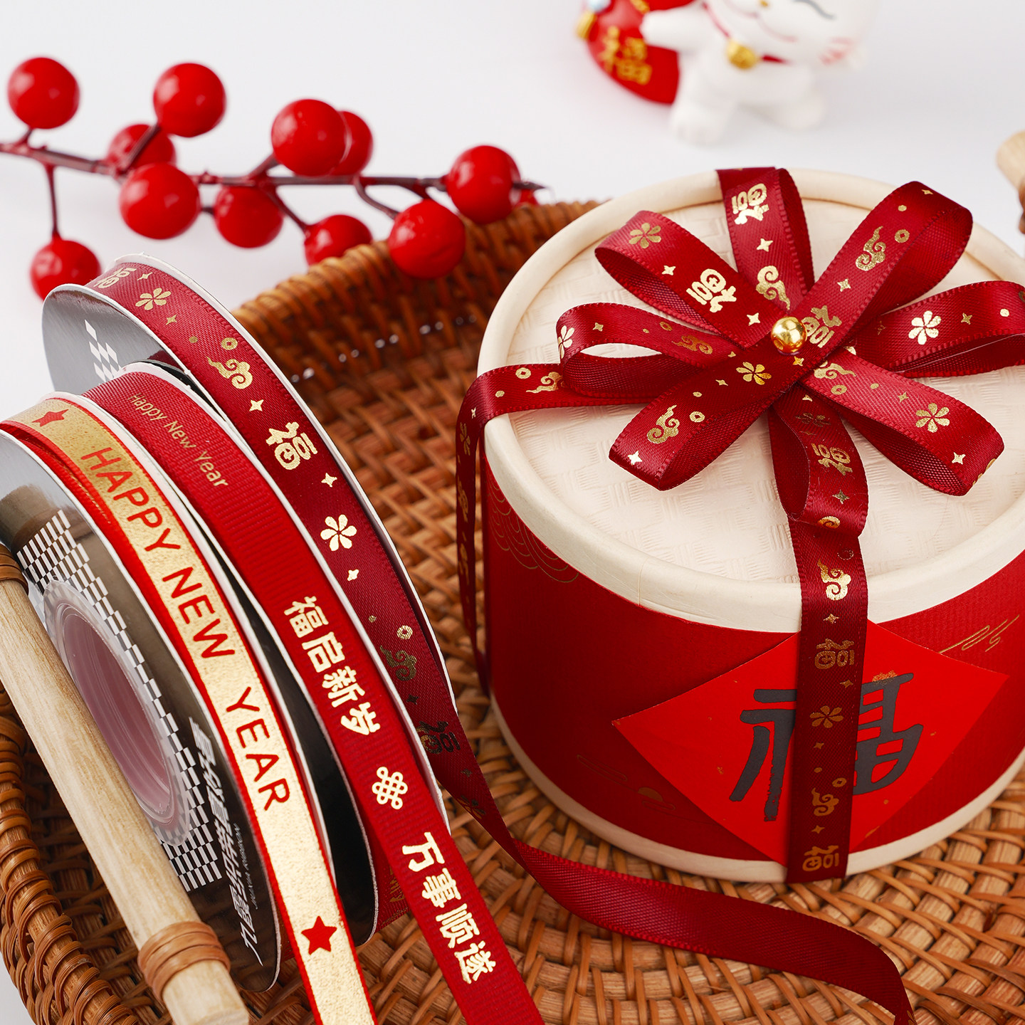 1CM新年丝带喜庆红色氛围装饰花束蛋糕手工diy蝴蝶结礼物盒包装