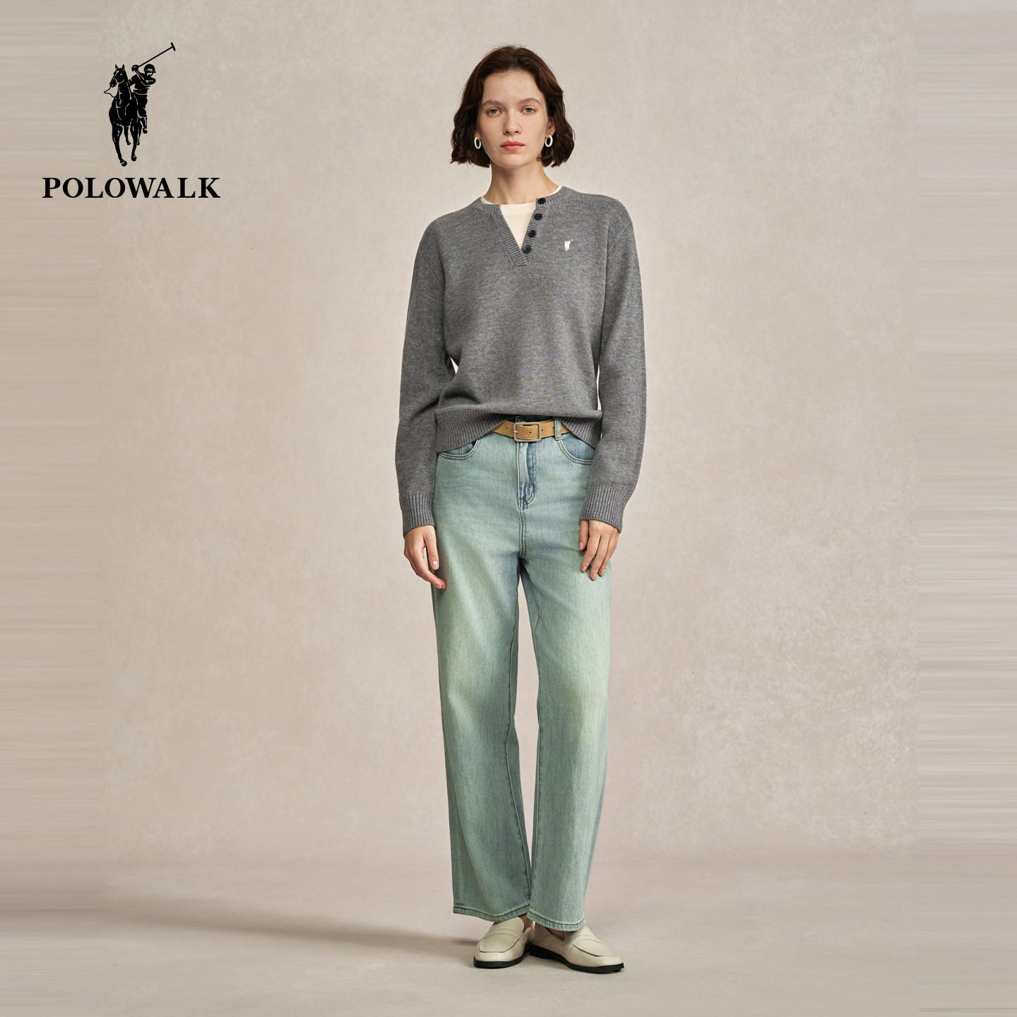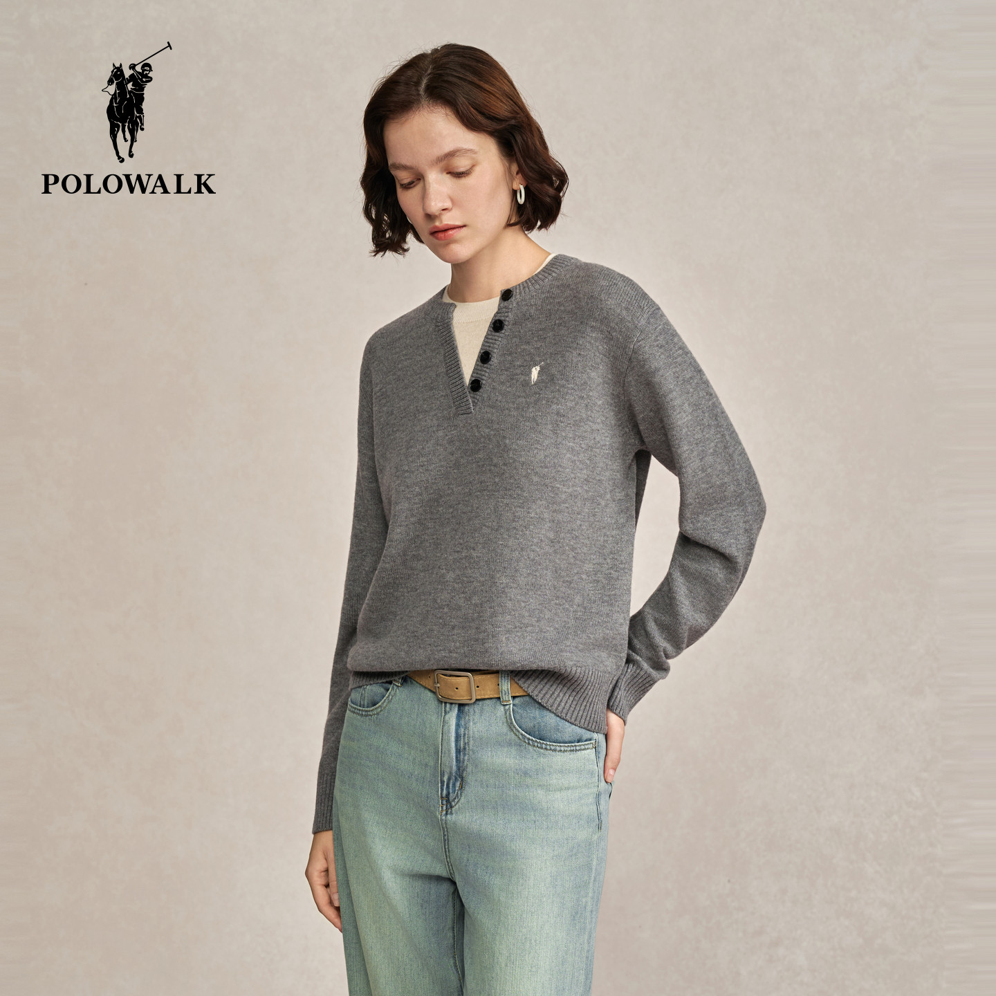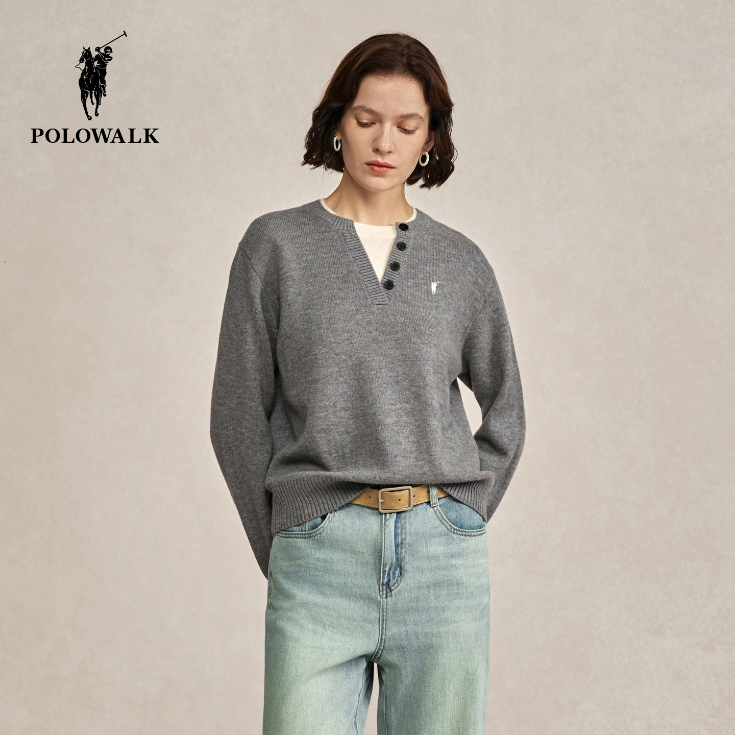 【100%绵羊毛】POLOWALK女式羊毛衫2025冬季新品韩版拼接领上衣女
