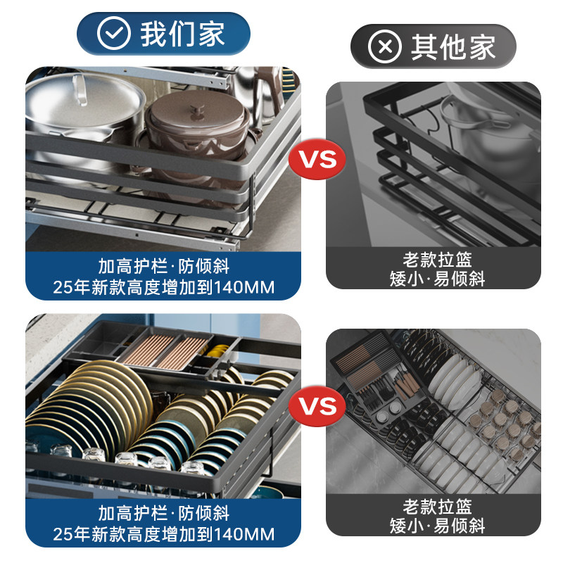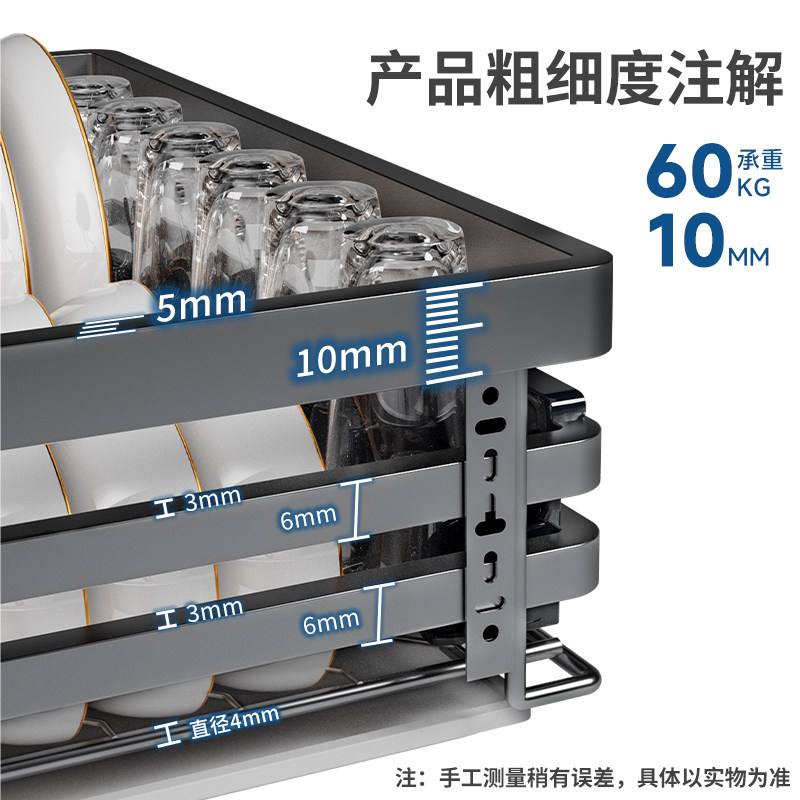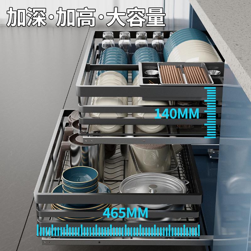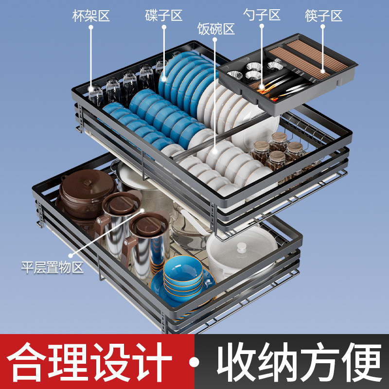 拉篮厨房橱柜抽屉式双层碟架304不锈钢收纳碗碟置物架单层柜体
