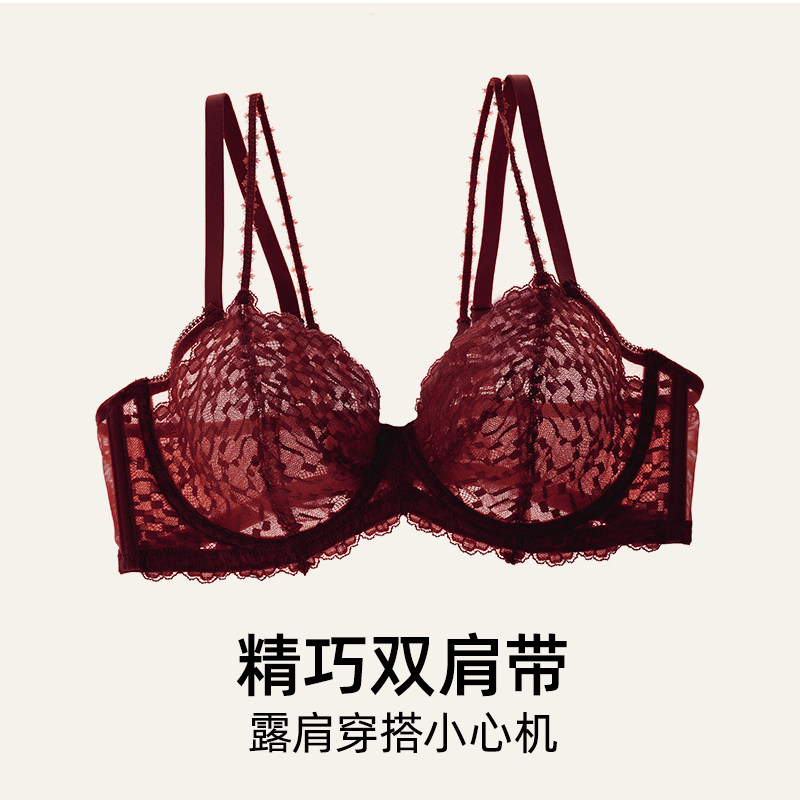 【点彩】遐法式本命年红色内衣女显瘦细肩带性感蕾丝大胸显小文胸