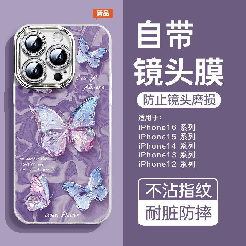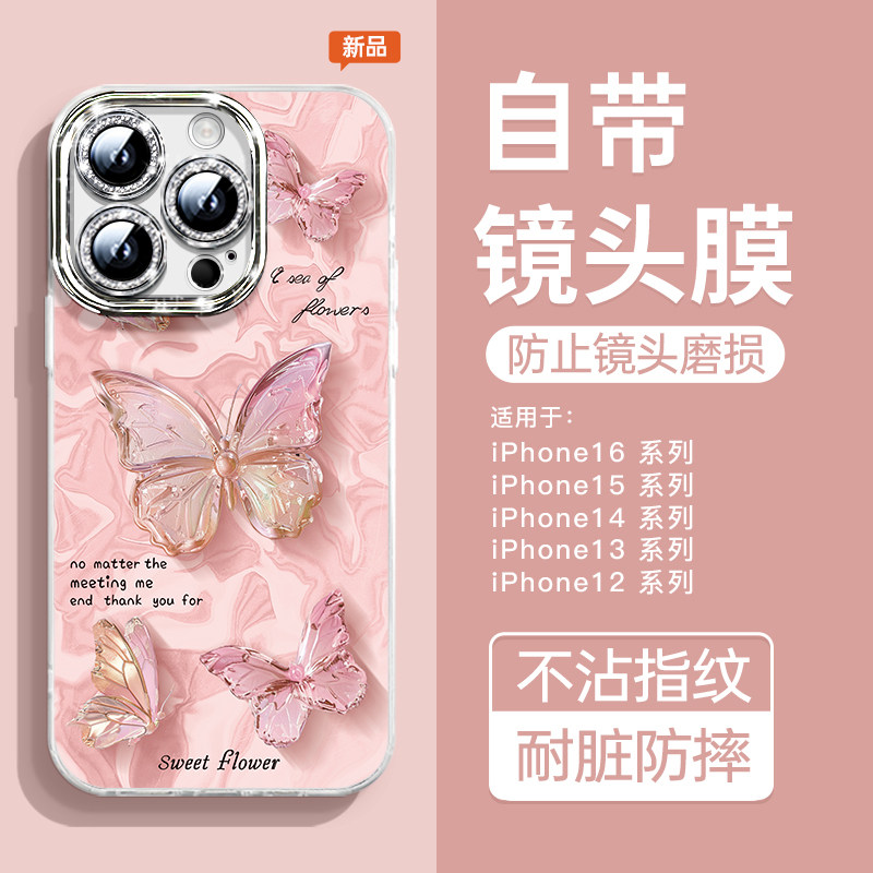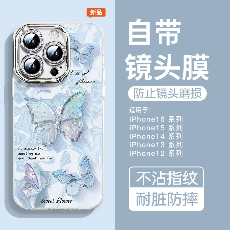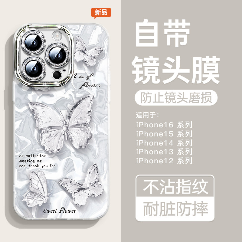 高级感水波纹蝴蝶适用苹果15promax手机壳16新款14带水钻链条13镜头膜11艺术12防摔全包iphone15pro小众女ins
