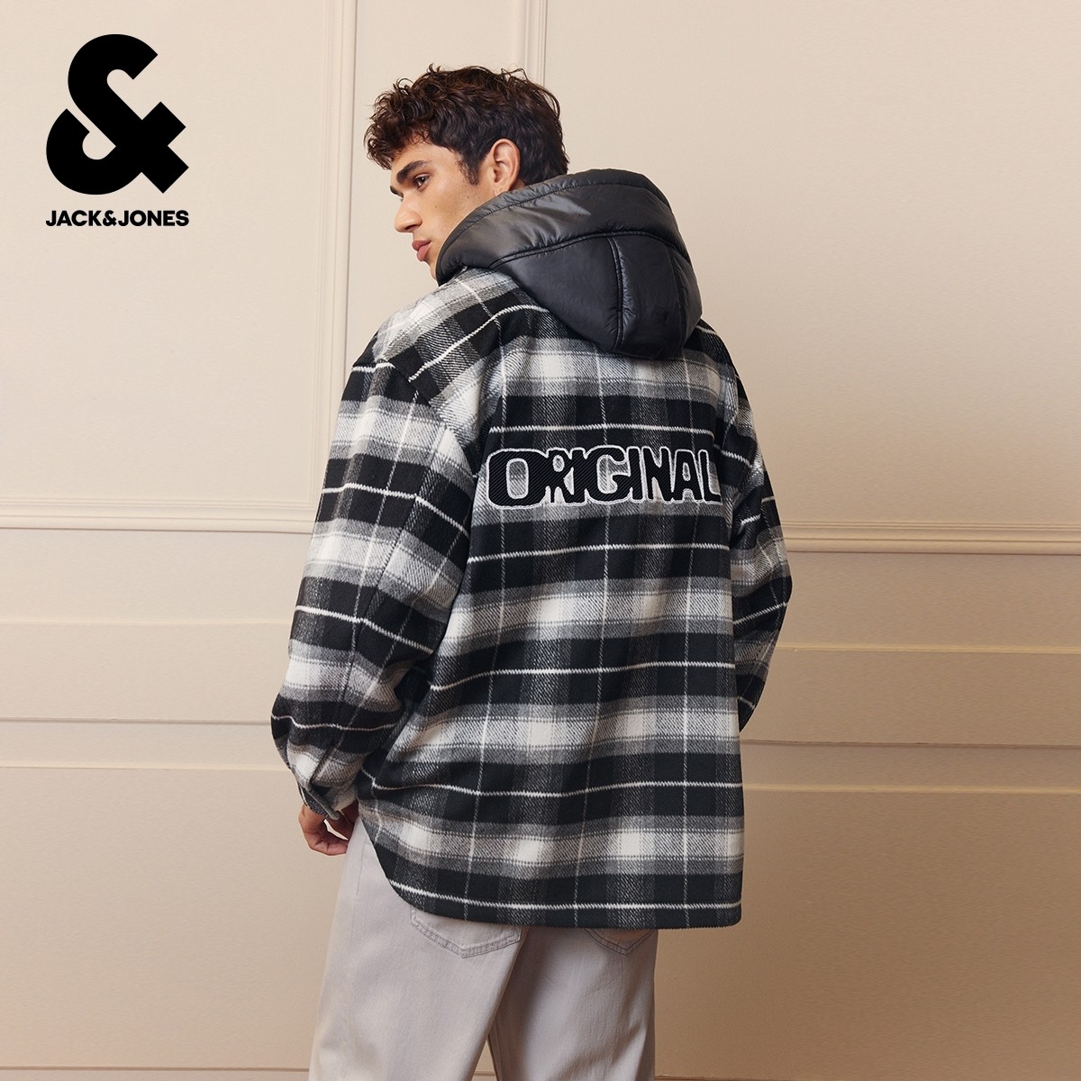 杰克琼斯奥特莱斯男装毛呢大衣冬刺绣格纹可拆连帽领宽松外套上衣