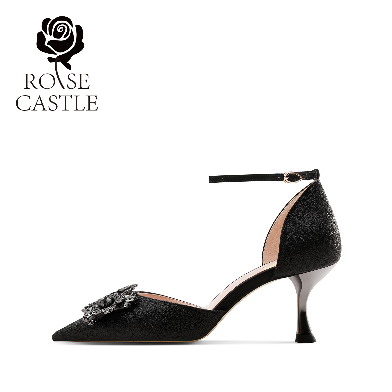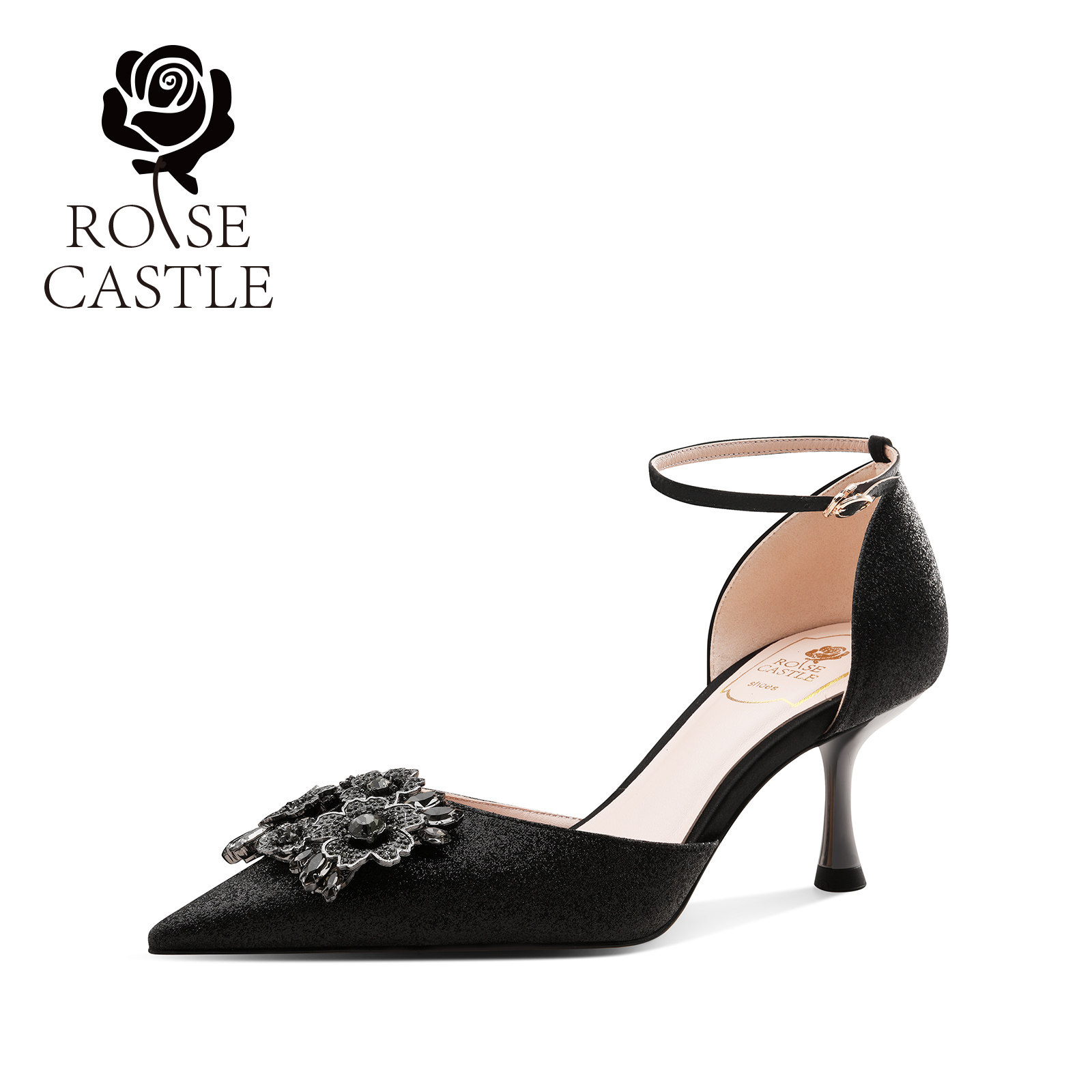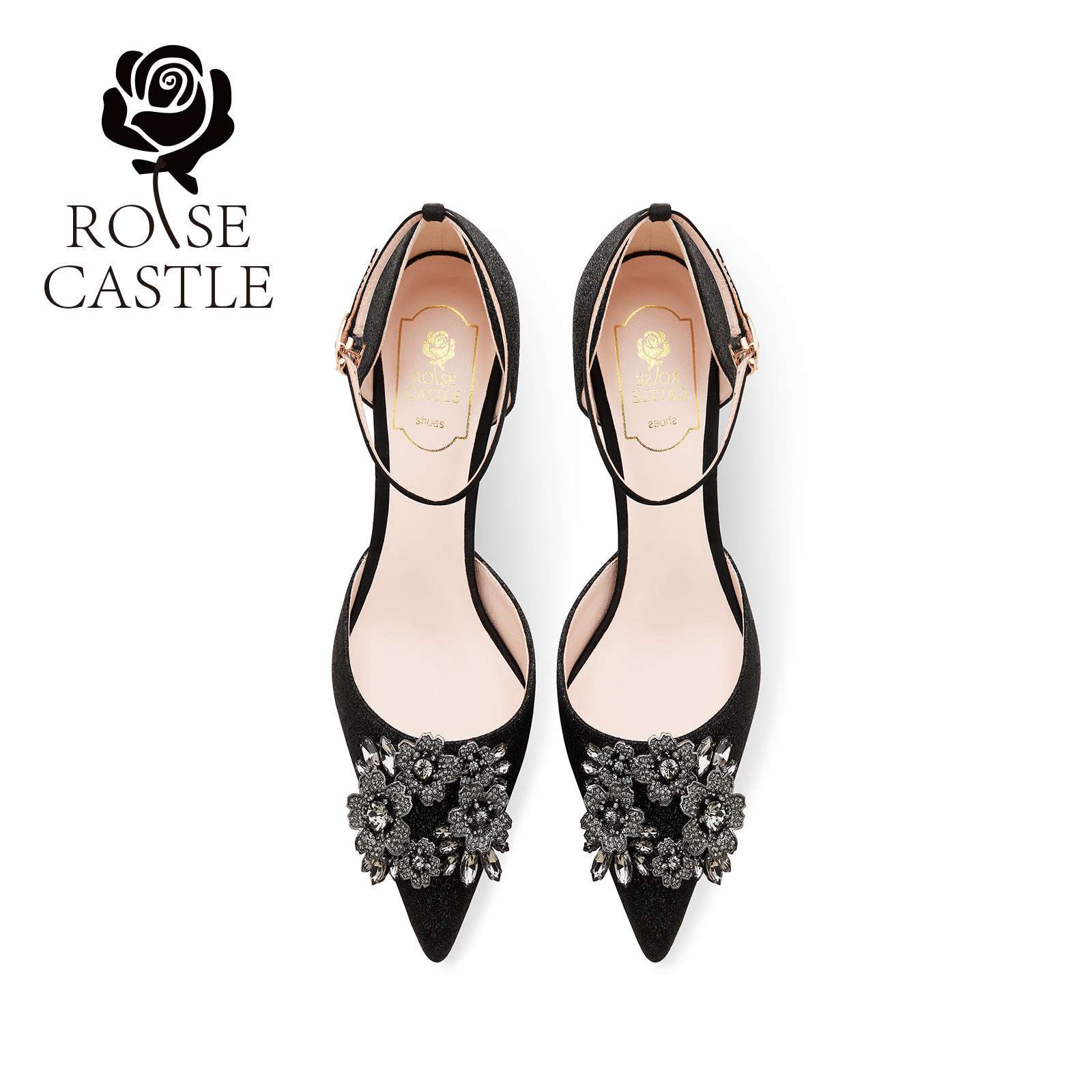 璀璨之花rosecastle气质尖头时装凉鞋女夏季时尚一字带黑色高跟鞋