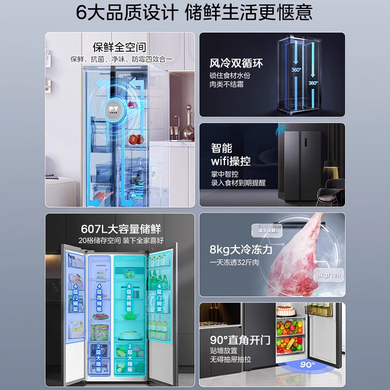 美的607L对开双门大容量一级双变频超薄嵌入式风冷无霜家用电冰箱