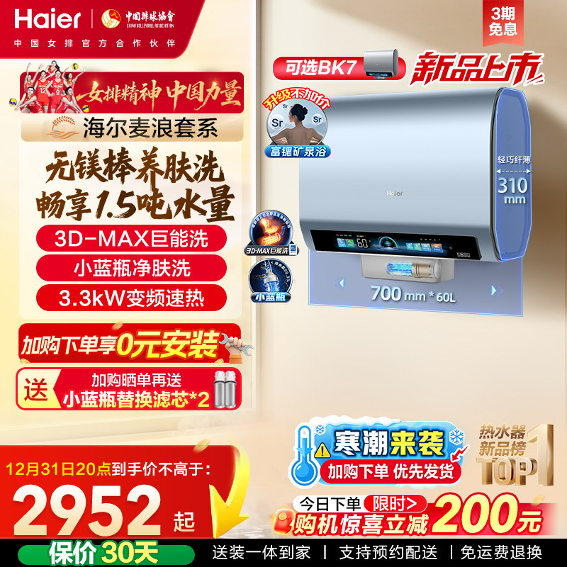 海尔麦浪电热水器官方换新补贴BK7plus小蓝瓶扁桶双胆一级能效BK7