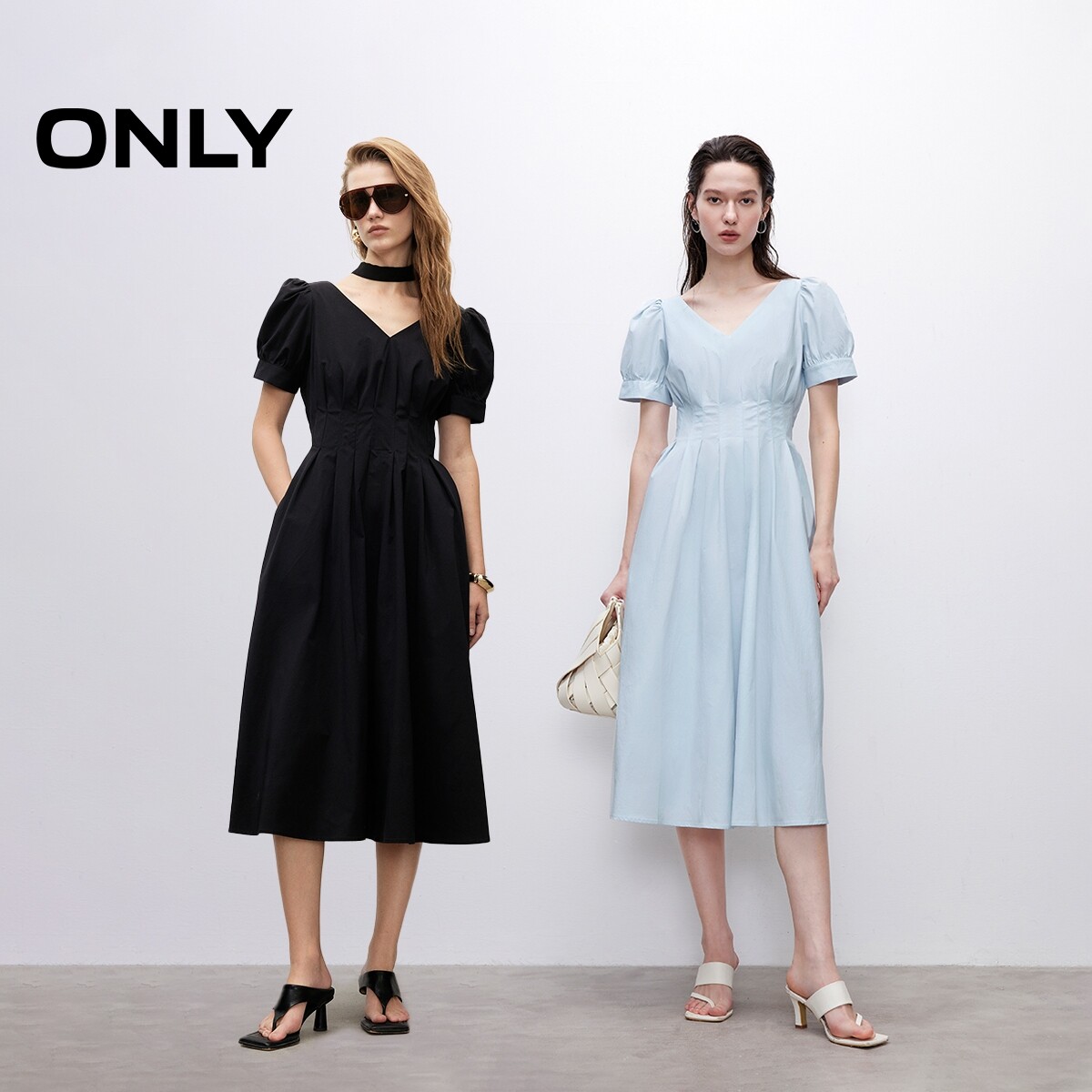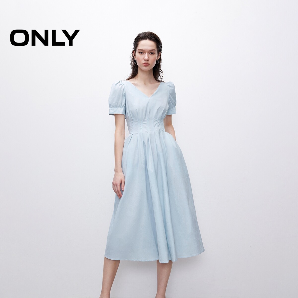 【ONLY奥莱】春夏纯色高腰V领泡泡袖收腰显瘦中长裙短袖连衣裙女