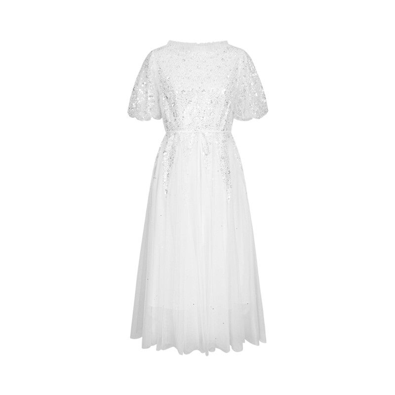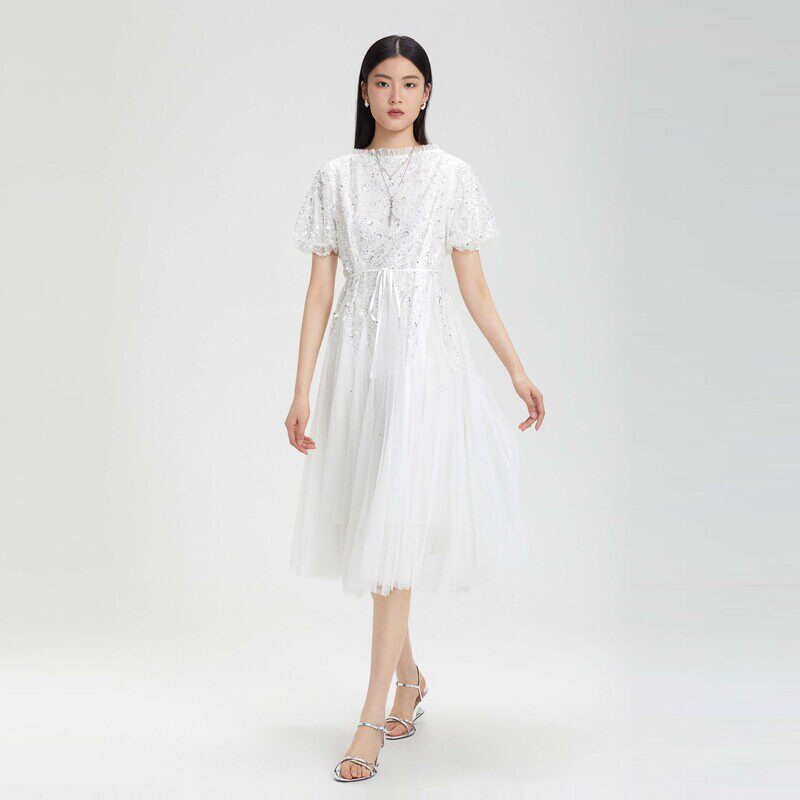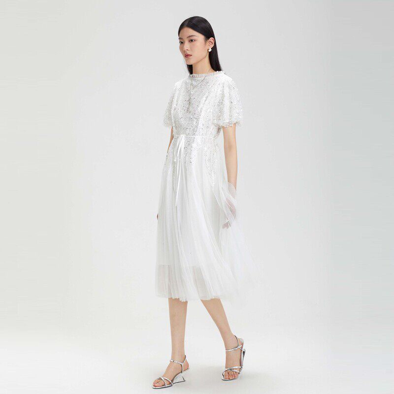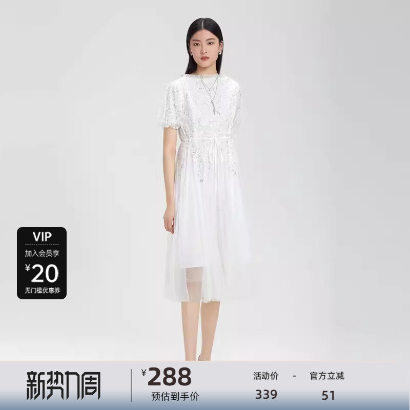 sdeer圣迪奥女装甜美圆领收腰网纱泡泡袖连衣裙S232Z12C5