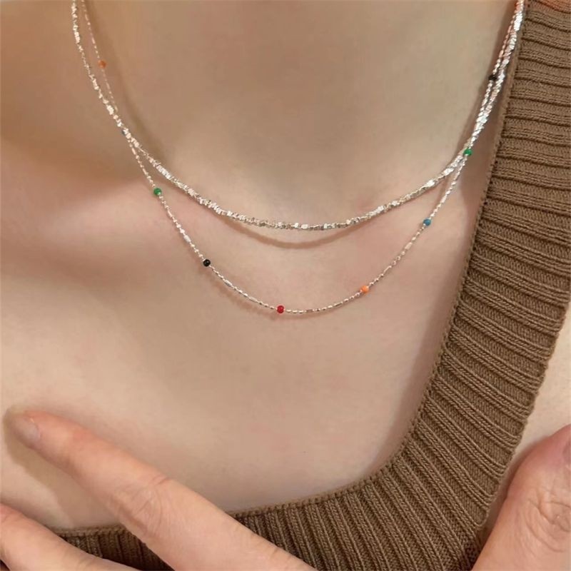 花雾意境双层小豆子串珠项链彩色叠戴碎银可调节仙女锁骨链可爱