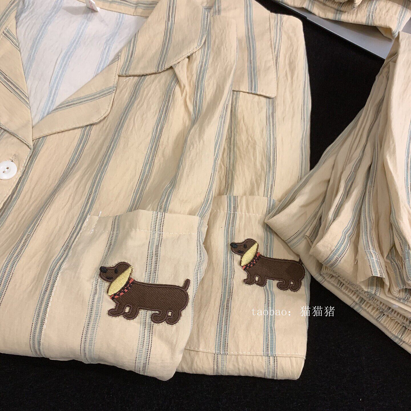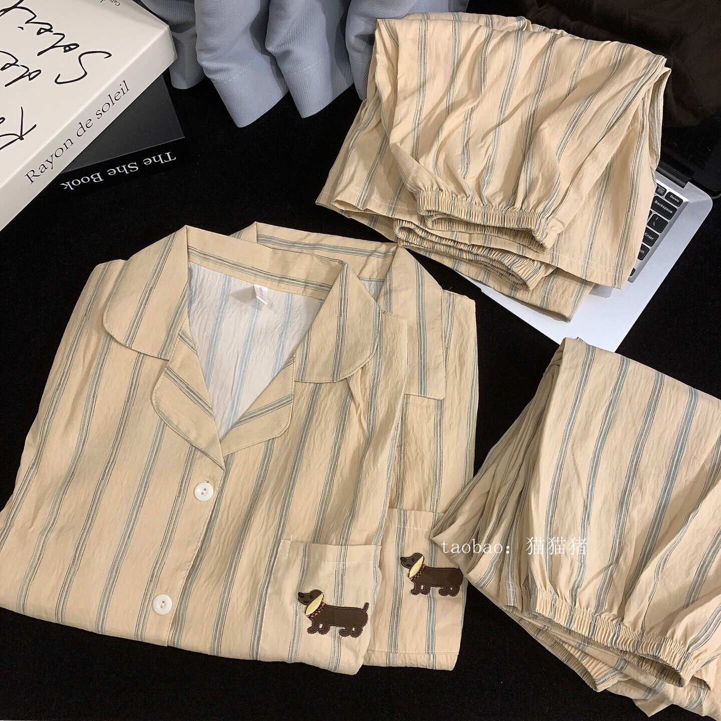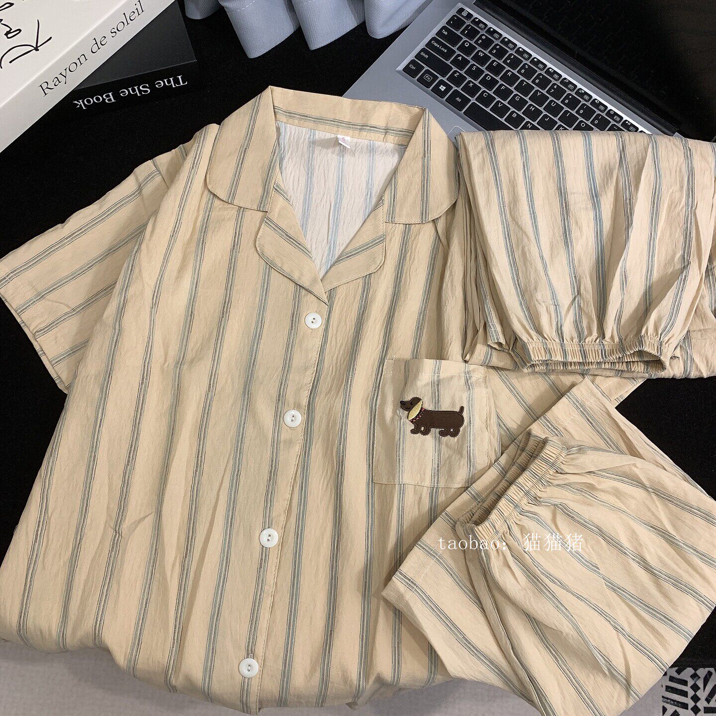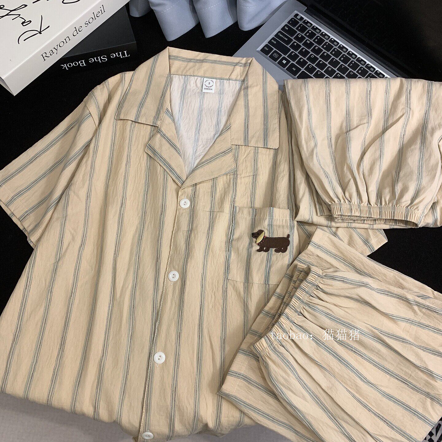 红豆条纹腊肠狗男士短袖三件套情侣睡衣女夏天纯棉纱大码学生家居