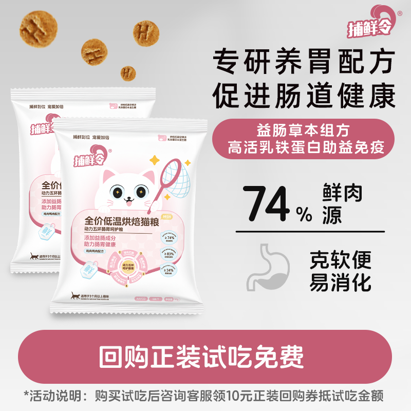 捕鲜令全价低温烘焙猫粮动力五环鲜肉护肠胃主粮成幼猫主食试吃装